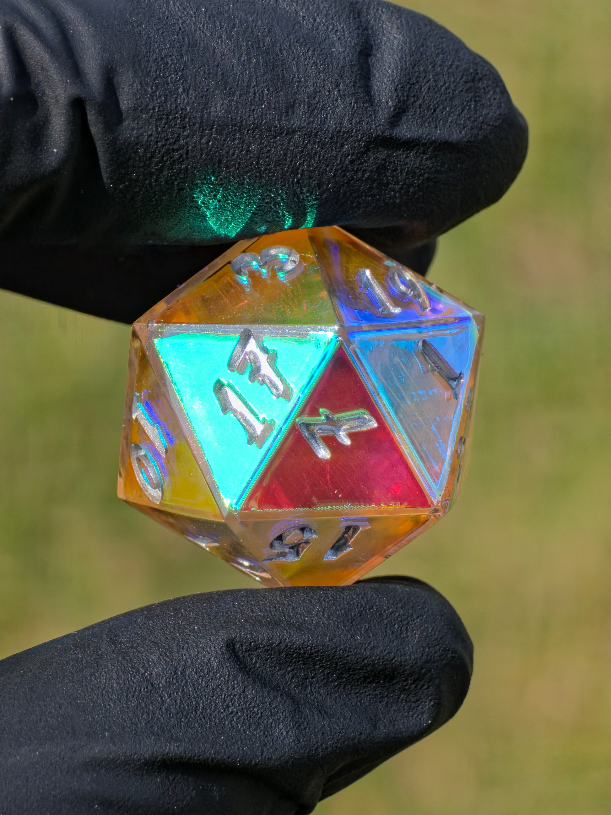 Ein klarer D20 mit lebendigem prismatischen Lichtspiel, das je nach Blickwinkel zwischen warmen Goldtönen, Grün und Regenbogeneffekten wechselt.