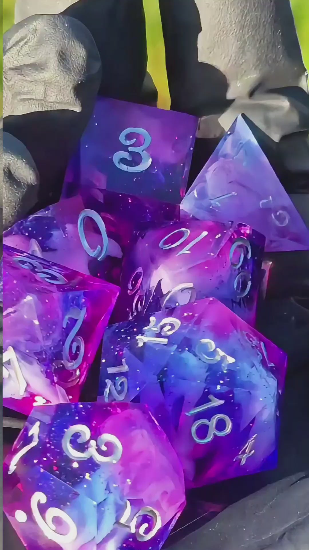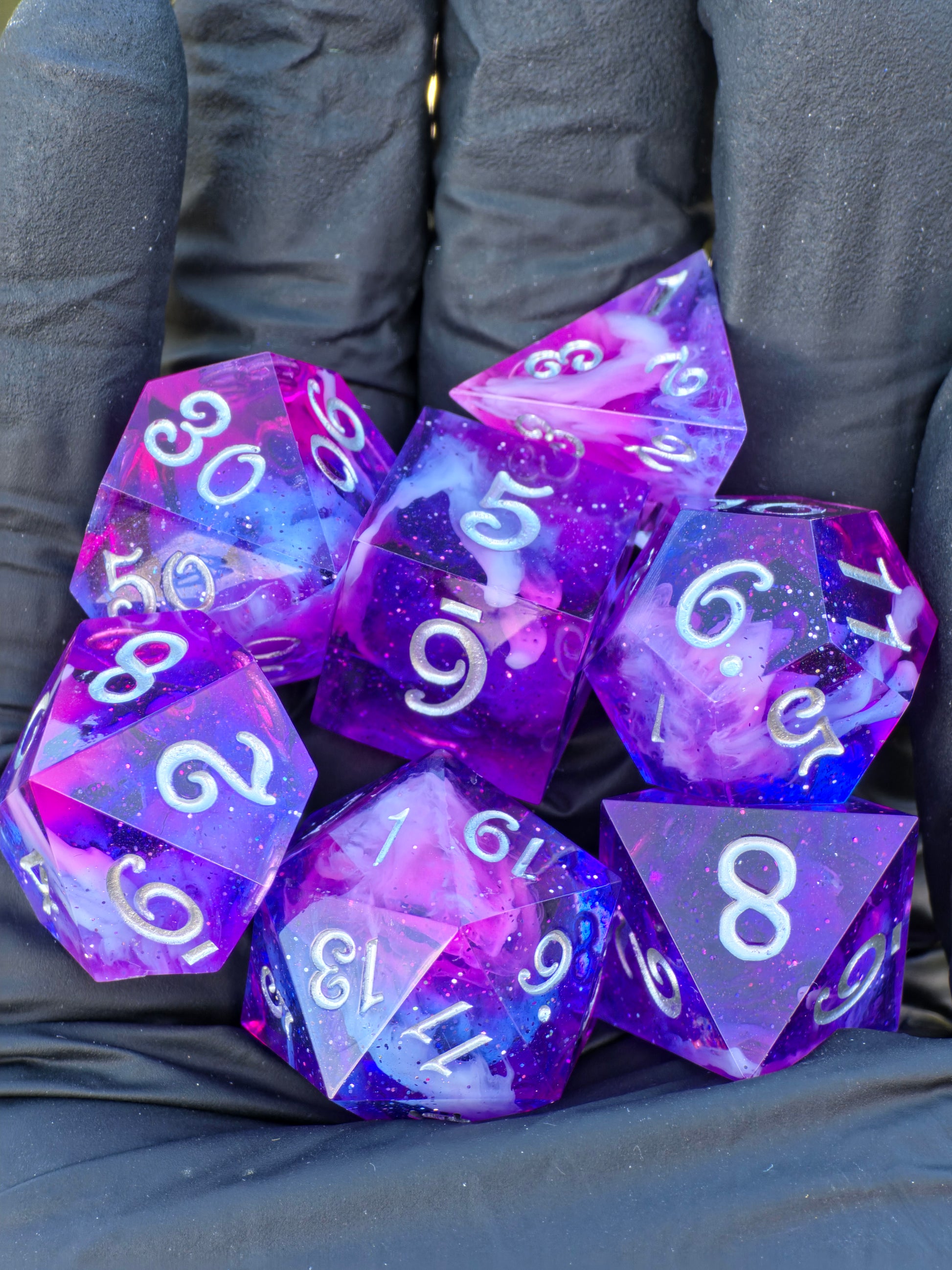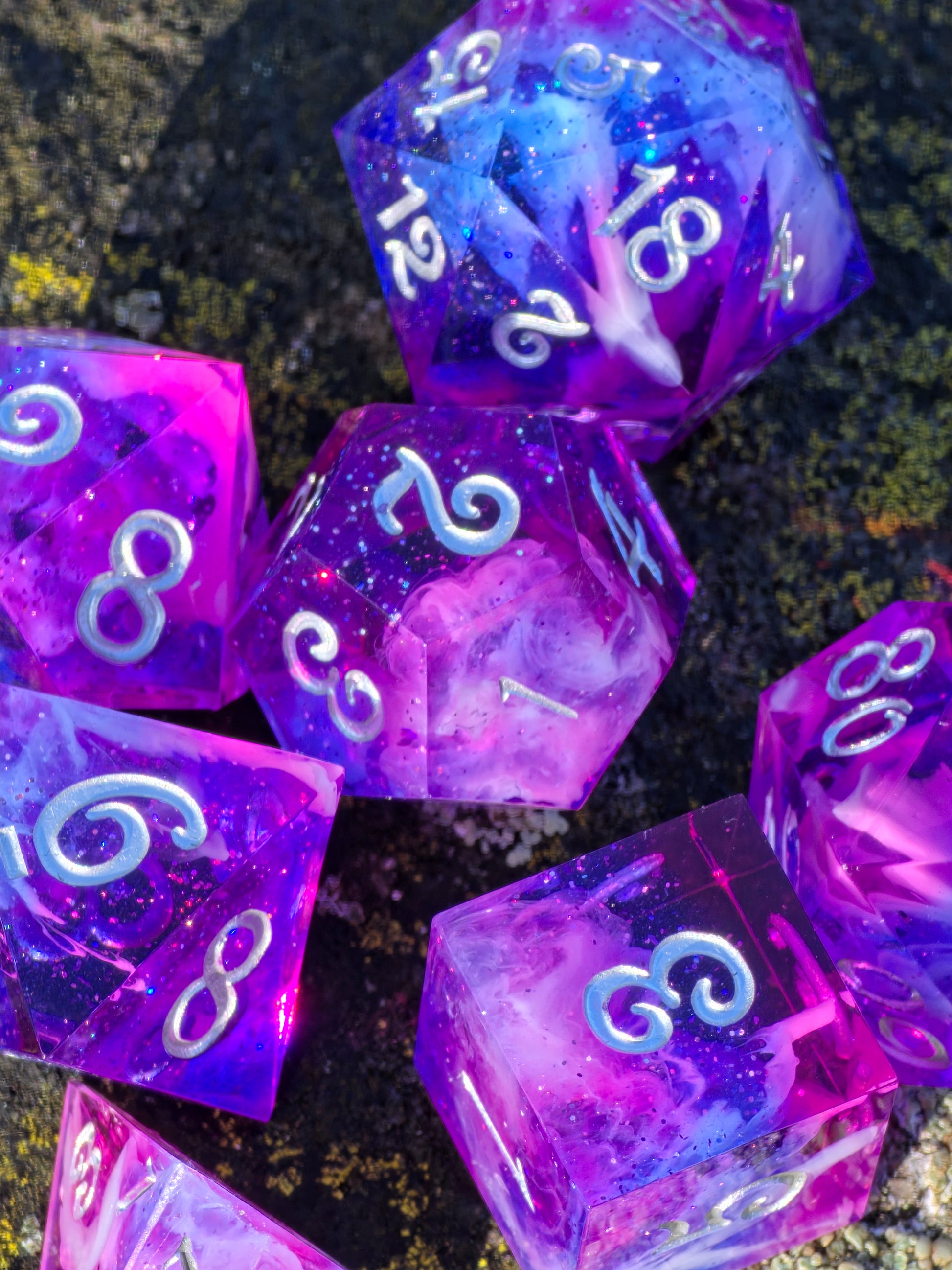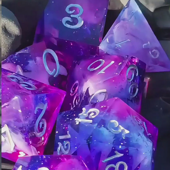 “Nebula Heart Galaxy” – a handcrafted polyhedral dice set that looks as if a piece of a cosmic nebula has been preserved in resin.