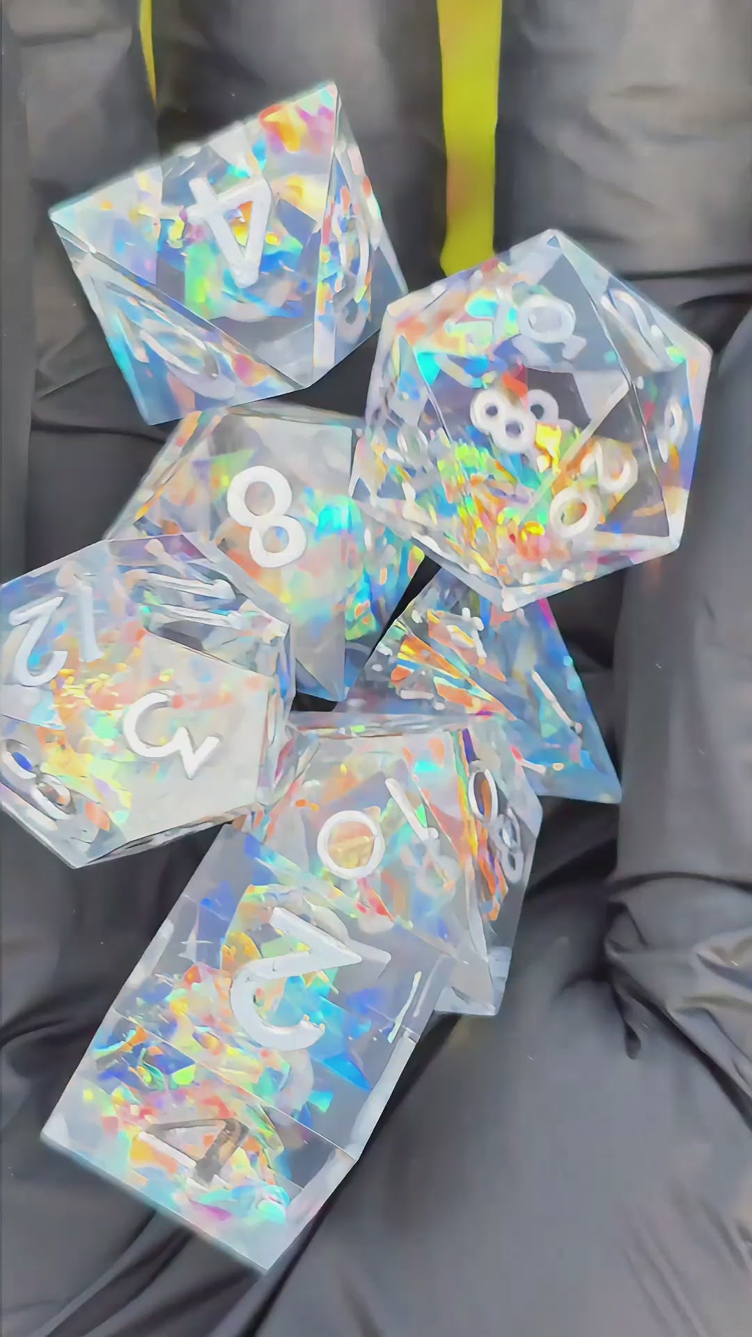 Aether Shards ist ein handgefertigtes, holografisches polyedrisches Würfelset aus kristallklarem Resin, durchzogen von schimmernden Fragmenten, die sich beim Rollen wie flüssiges Licht bewegen.