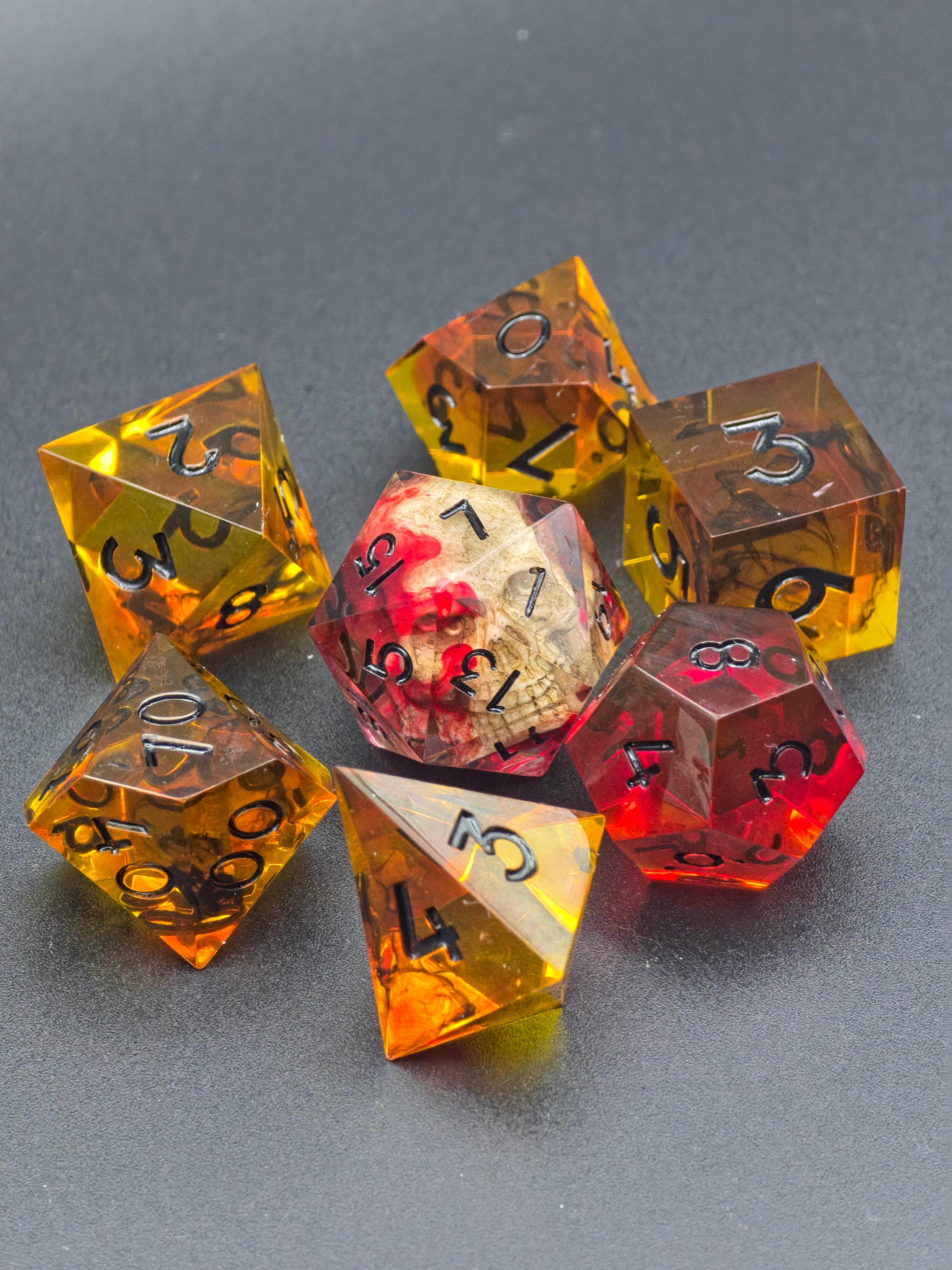 Im Zentrum liegt ein Schädel, eingefasst in einer roten Wolke, als hätte sich Blutnebel in Harz verwandelt. Um ihn herum glühen die übrigen Würfel in hellem Hellfire-Gelb und warmem Bernstein – wie Feuer, das nie ganz erlischt.