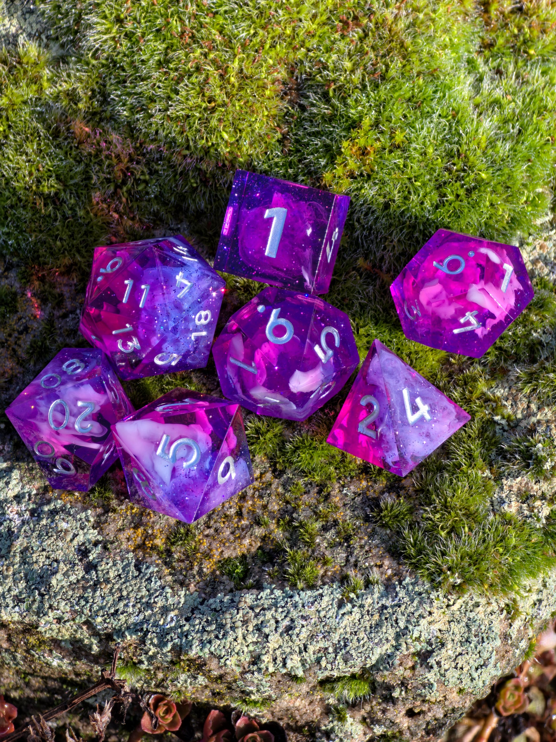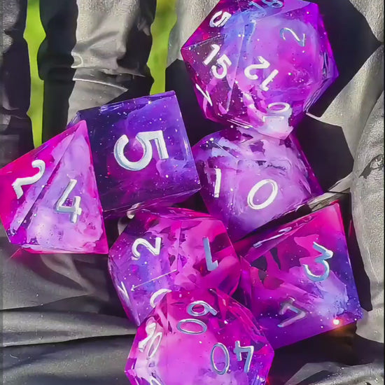 Astral Bloom Nebula – Polyedrisches Würfelset | Pink-Violett Galaxy & Cloud Effekt | Handmade Resin DnD Dice Set mit silbernen Zahlen | TTRPG Würfel