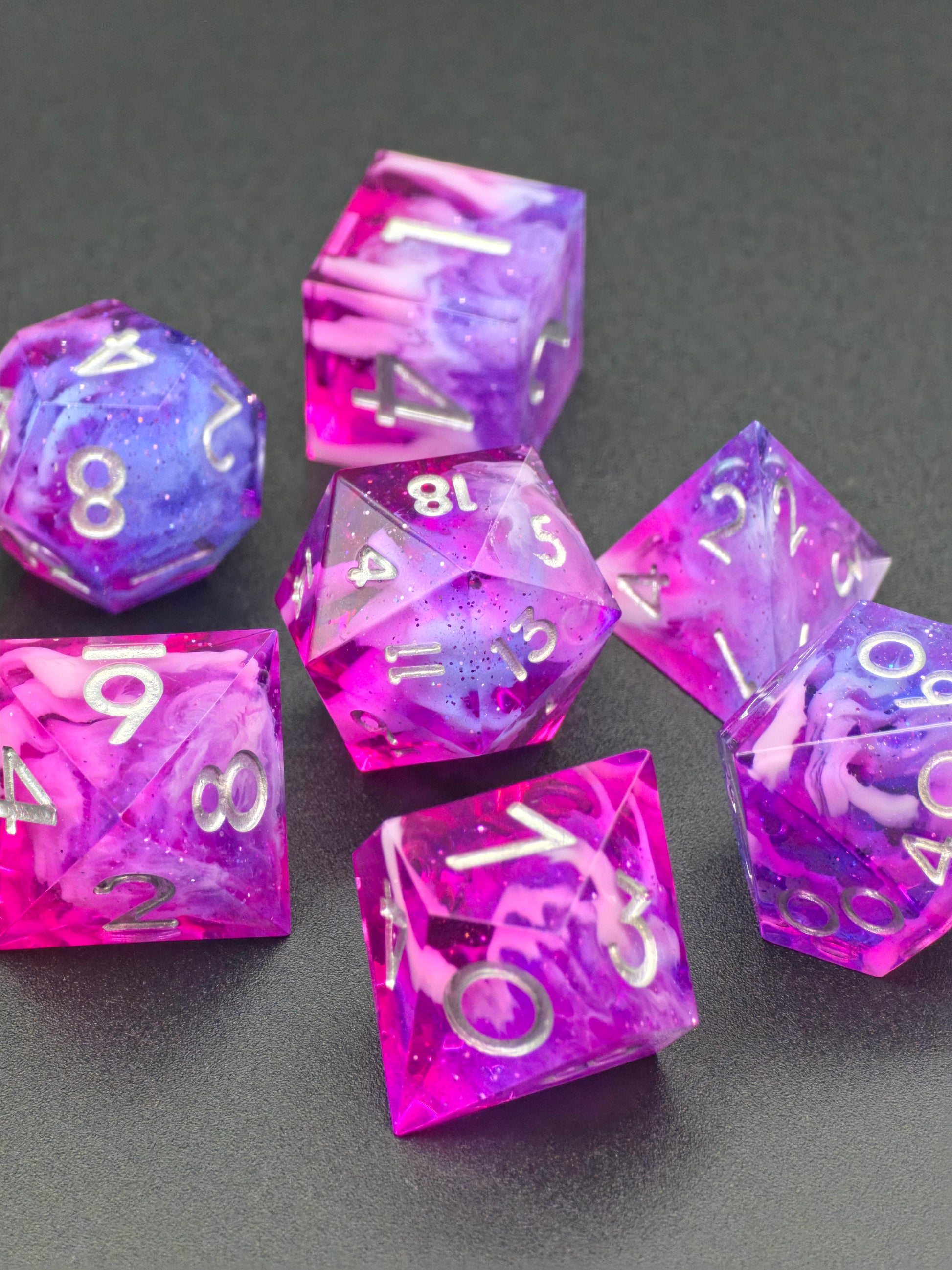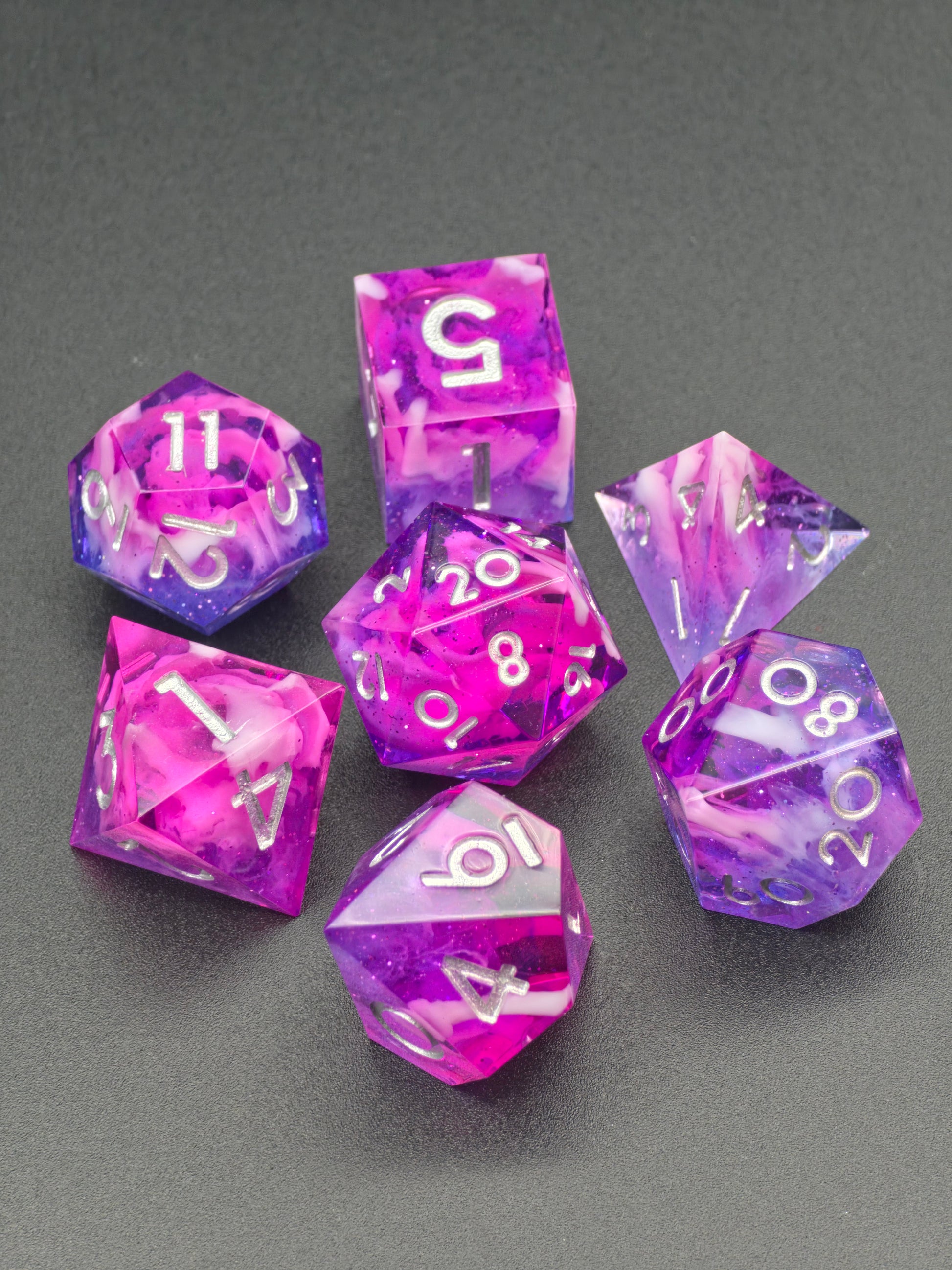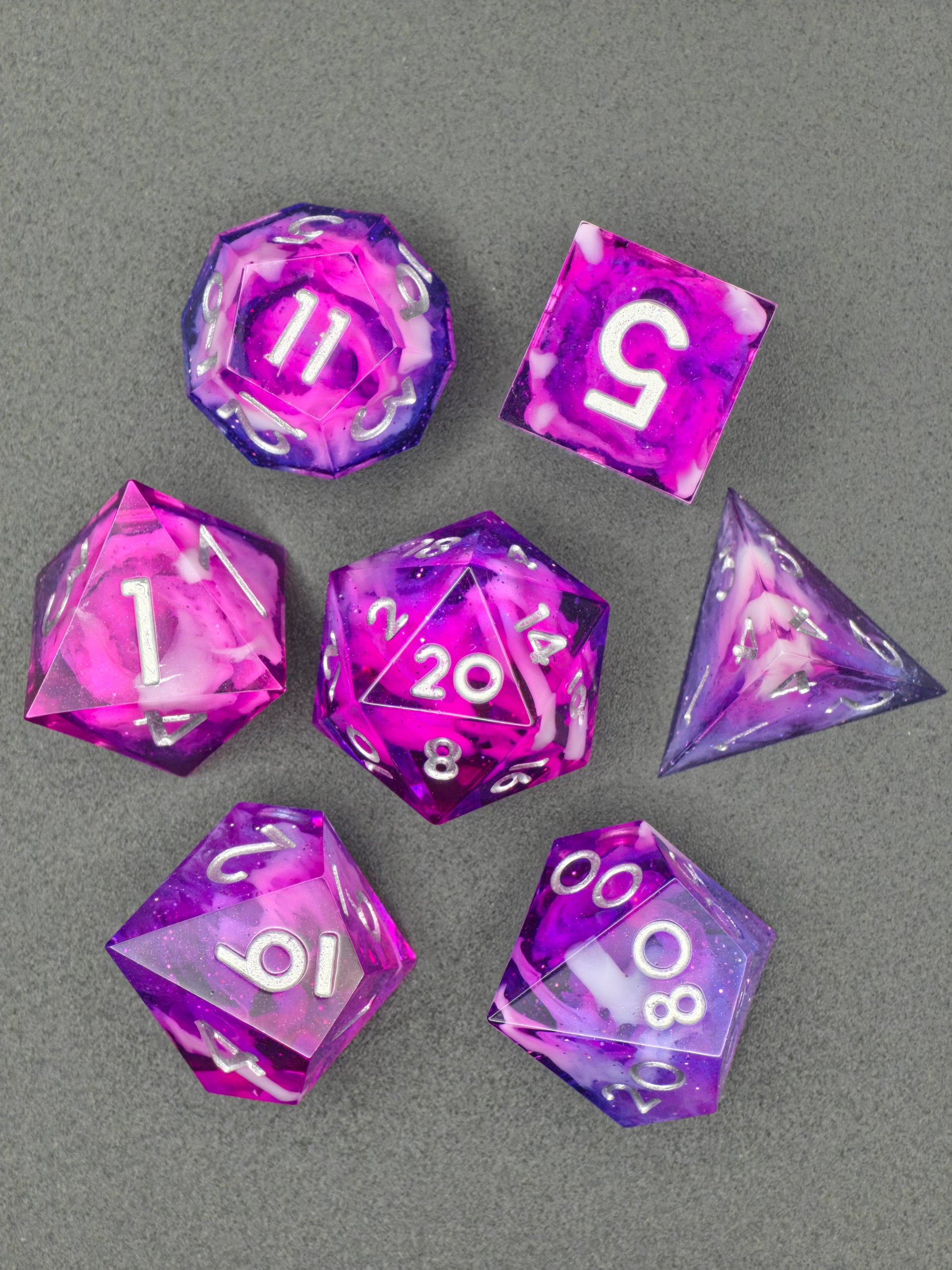 Astral Orchard – Handgemachtes DnD Würfelset violett rosa mit Petri Effekt und silbernen Zahlen | 7-teiliges Polyhedral Set | Resin Dice | TTRPG RPG Würfel