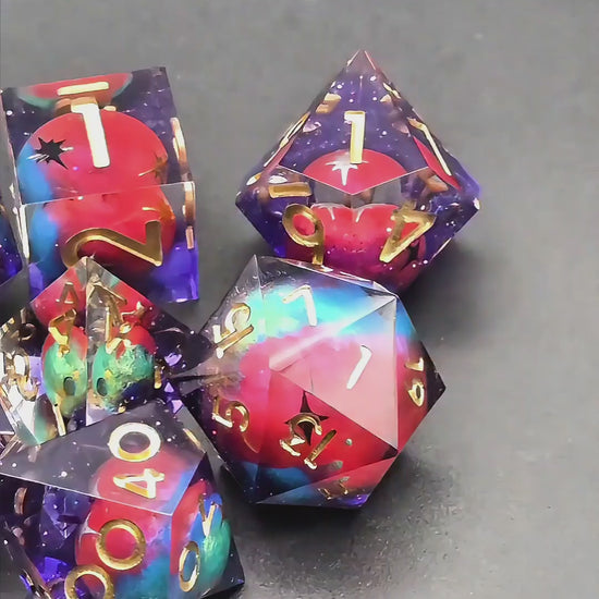 Astral Realms – Relikte der Sternenfürsten | Galaxy Planet Dice Set | Handmade Resin DnD Würfel mit goldenen Zahlen | Premium TTRPG Dice