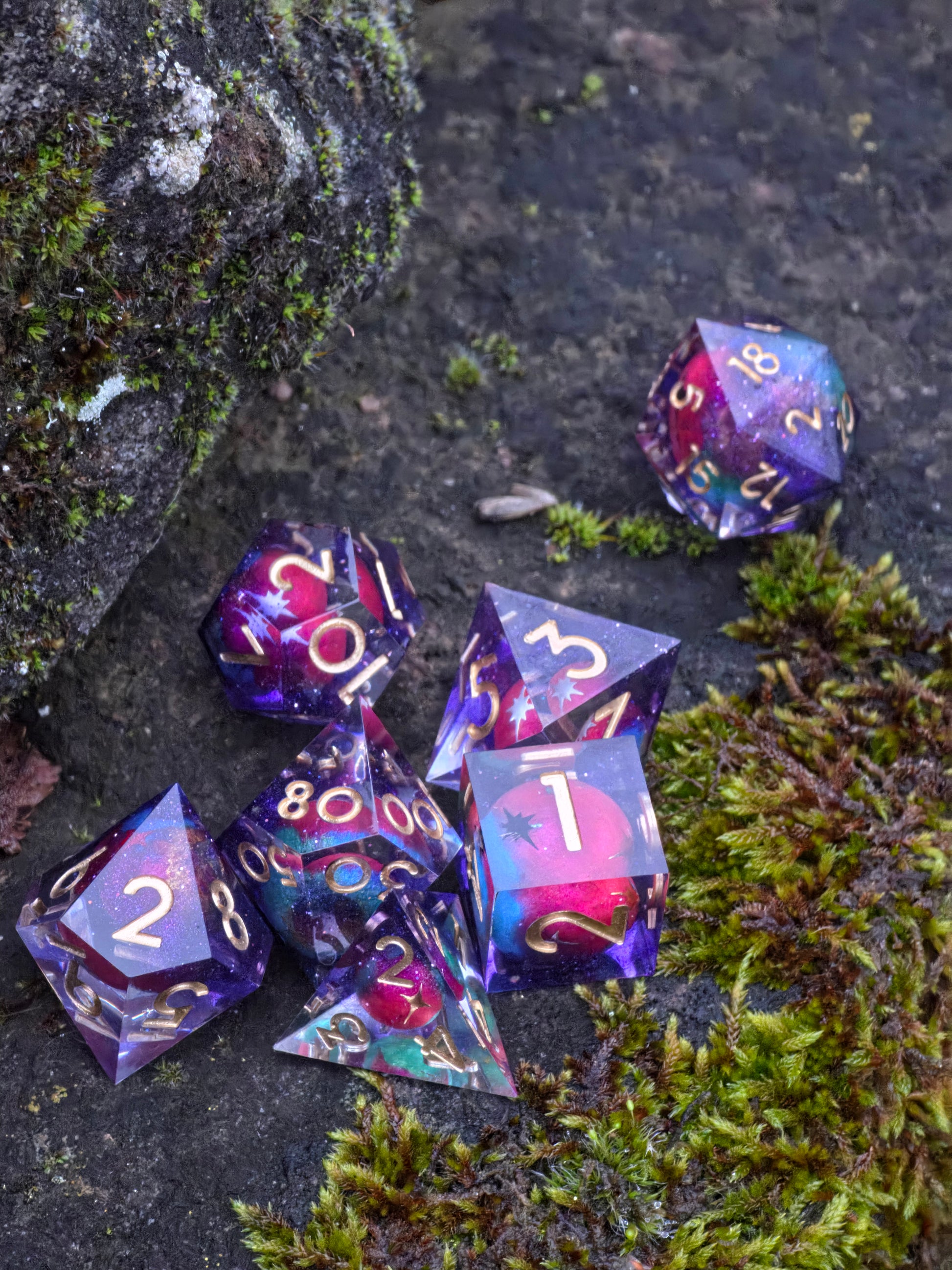 Astral Realms – Relikte der Sternenfürsten ist ein majestätisches, handgefertigtes polyedrisches Würfelset, in dem schimmernde Planetenkugeln in kosmischen Nebeln schweben. Jede Kugel wurde einzeln modelliert, poliert und in klarem Resin eingefangen – wie ein kristallisiertes Fragment der Schöpfung.