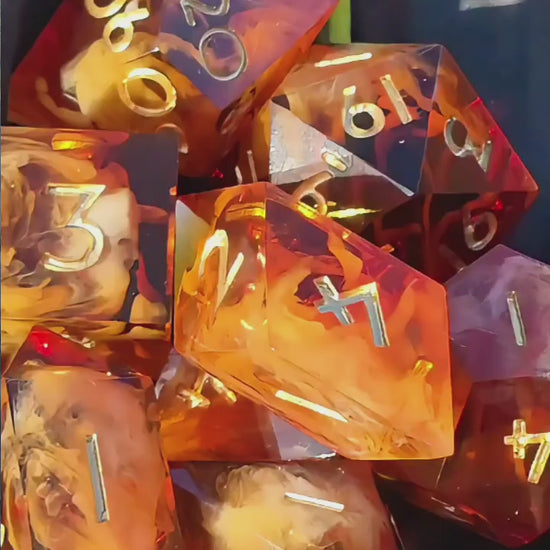 Caramel Ember Nebula – Polyedrisches Würfelset | Amber-Karamell Cloud Effekt | Handmade Resin DnD Dice Set mit goldenen Zahlen | TTRPG Würfel