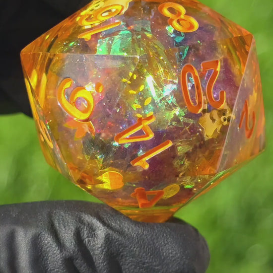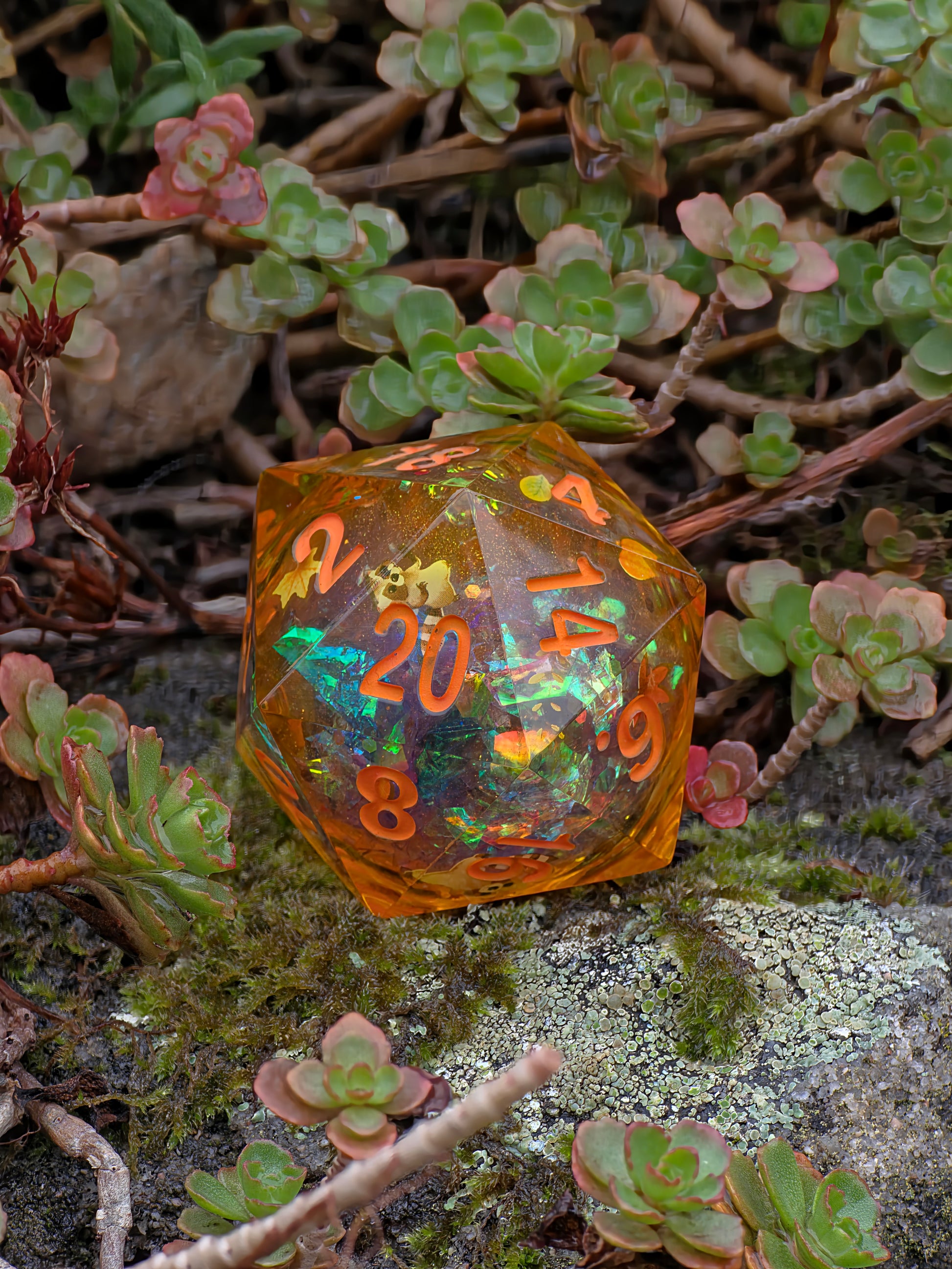 Dieser handgefertigte D20 Chonk Würfel (33–35 mm) im Liquid Core Stil ist eine Hommage an die goldene Jahreszeit.