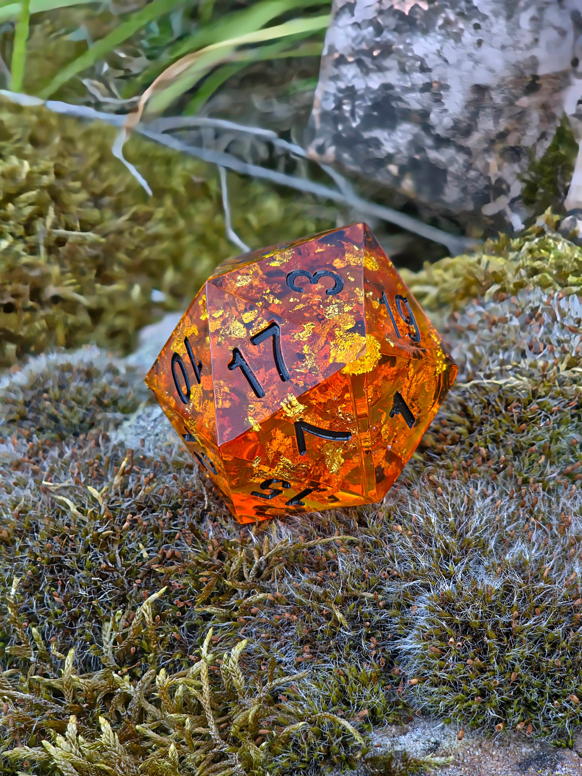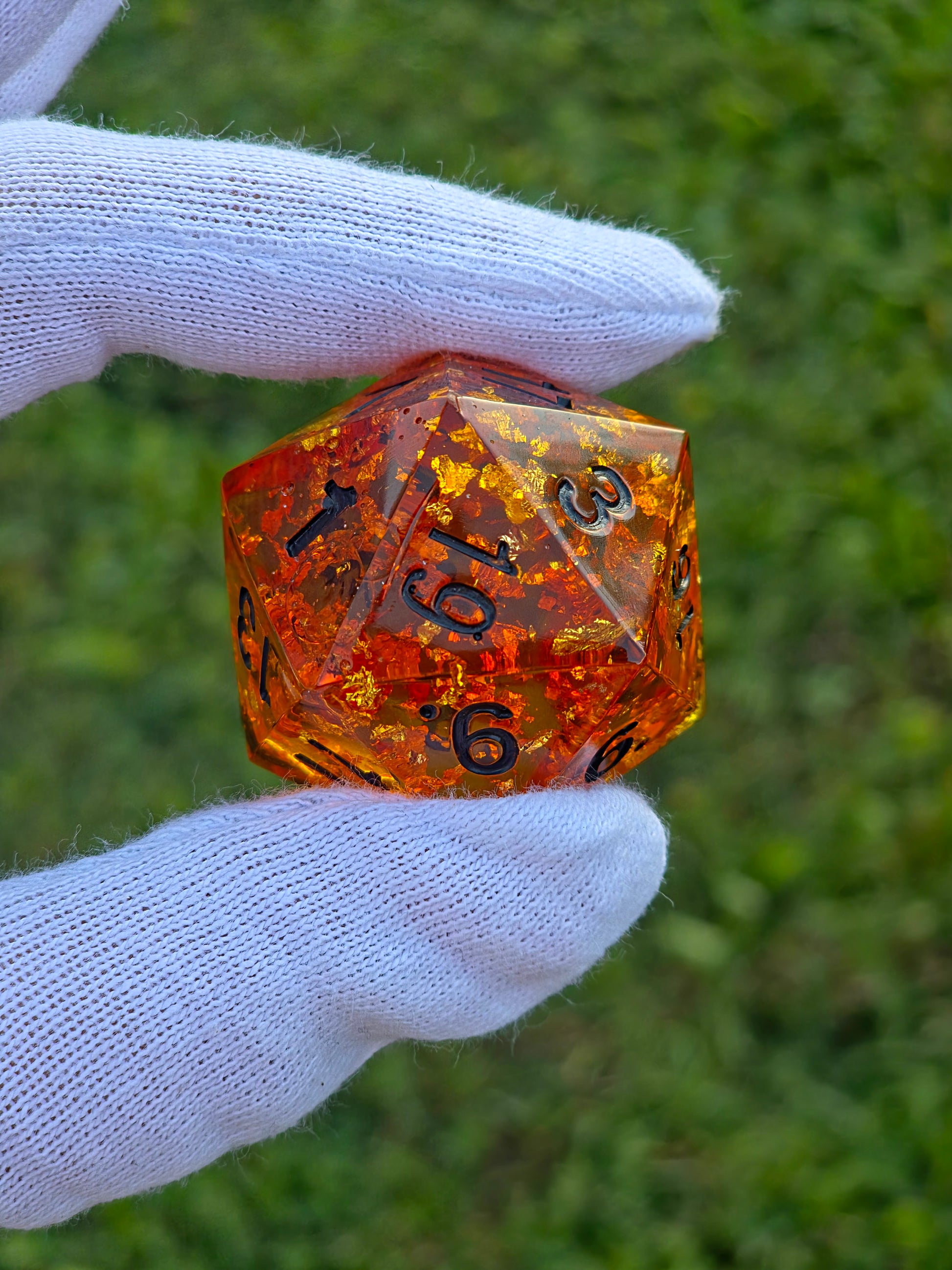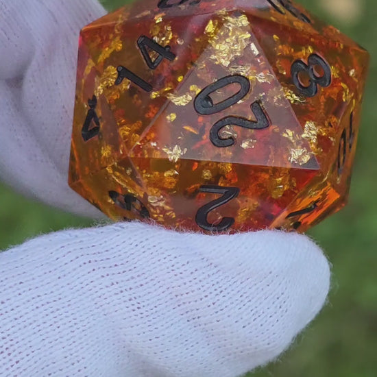 🎲 Großer polyedrischer D20 Würfel (35mm - 40mm) im Bernstein-Stil – handgegossen aus Epoxidharz mit goldenen Flakes.