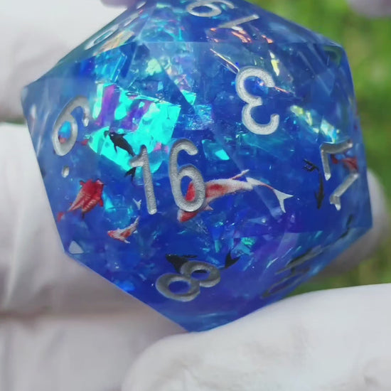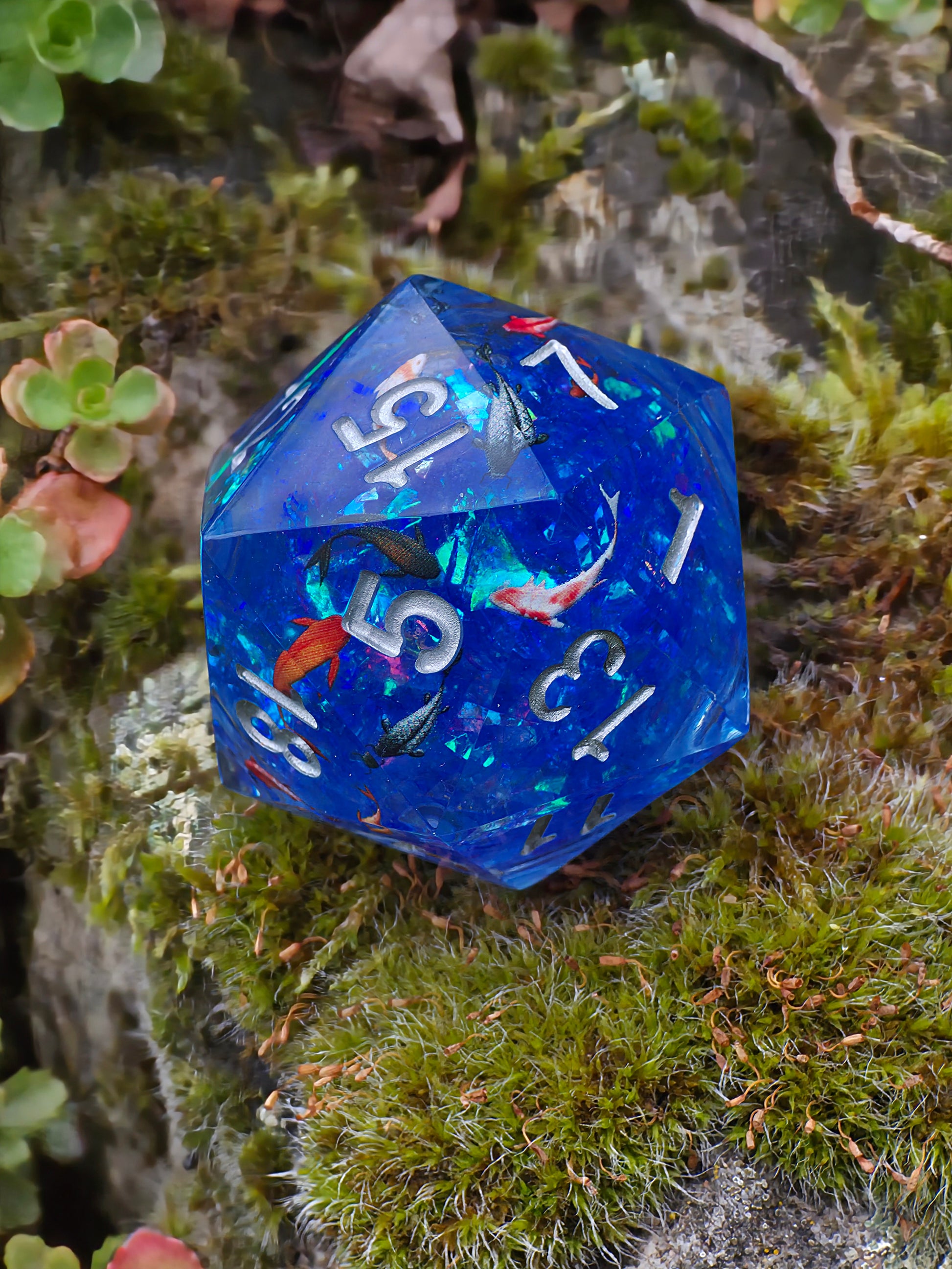 Chonk Polyedrischer D20 Würfel 35mm – Liquid Core mit Koi Fischen im See/Teich – Handgemachter Resin Würfel für DnD, TTRPG & Sammler
