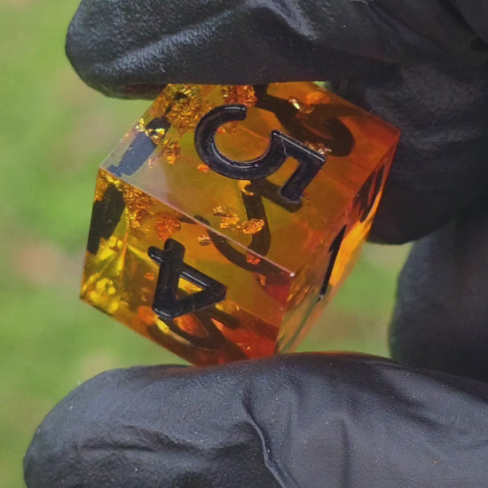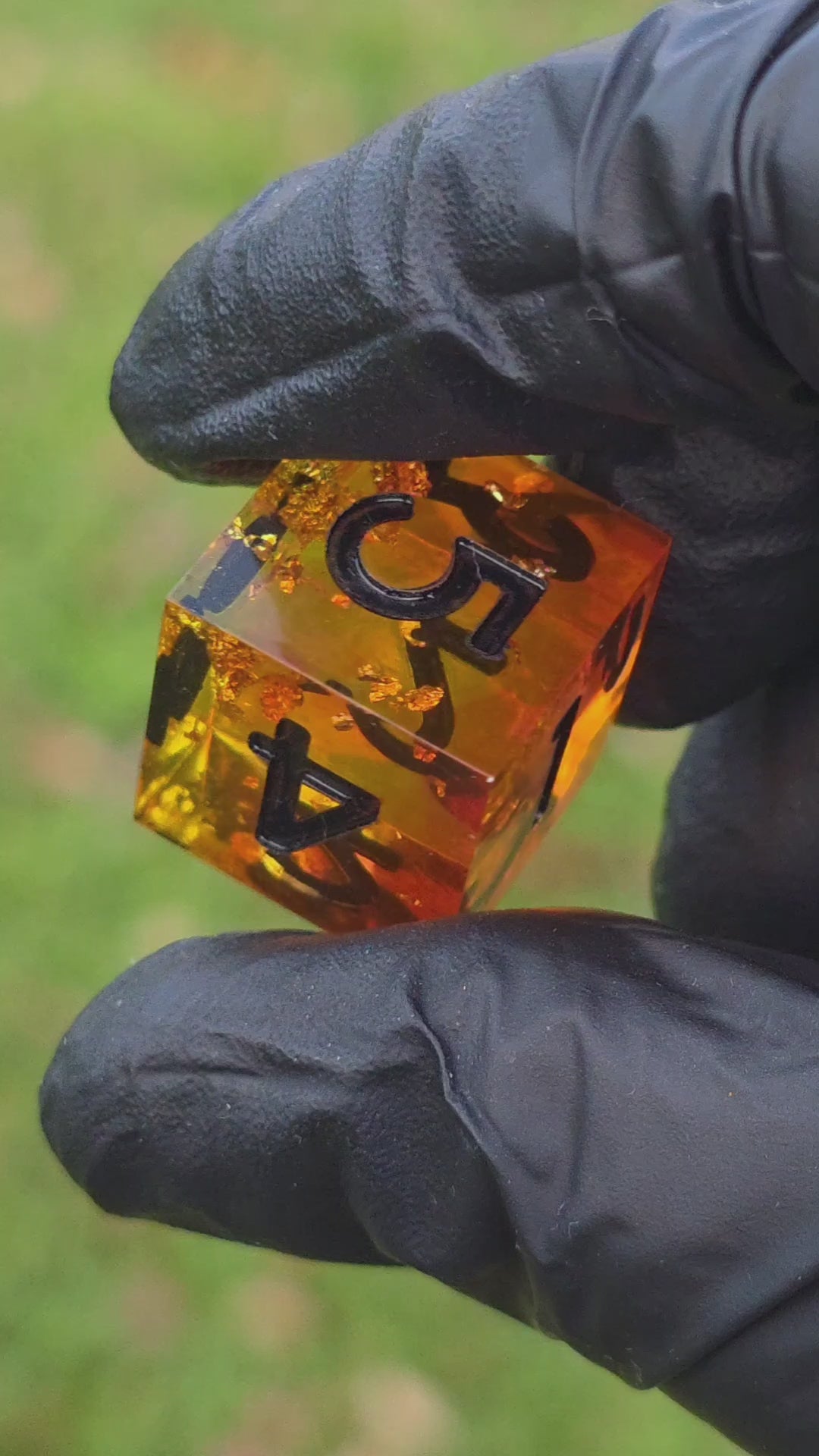 Einzelner D6 „Bernstein Fragment“ – Handgemachter Resinwürfel amber-orange mit Goldflakes | Standardgröße | DnD Dice TTRPG
