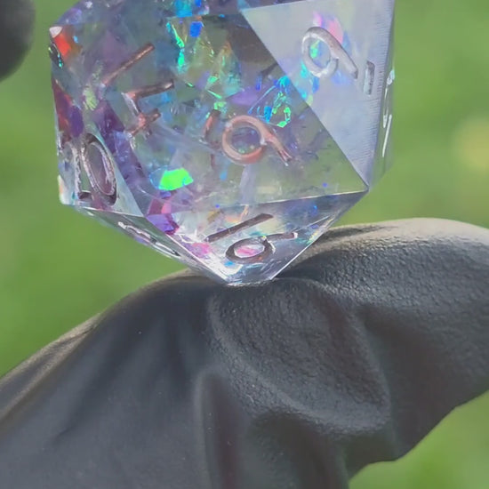 Einzelner Polyedrischer D20 – Aurora Crystal Würfel Transparent mit Opal Schimmer | Handgemachter Resinwürfel Standardgröße | DnD Pen and Paper