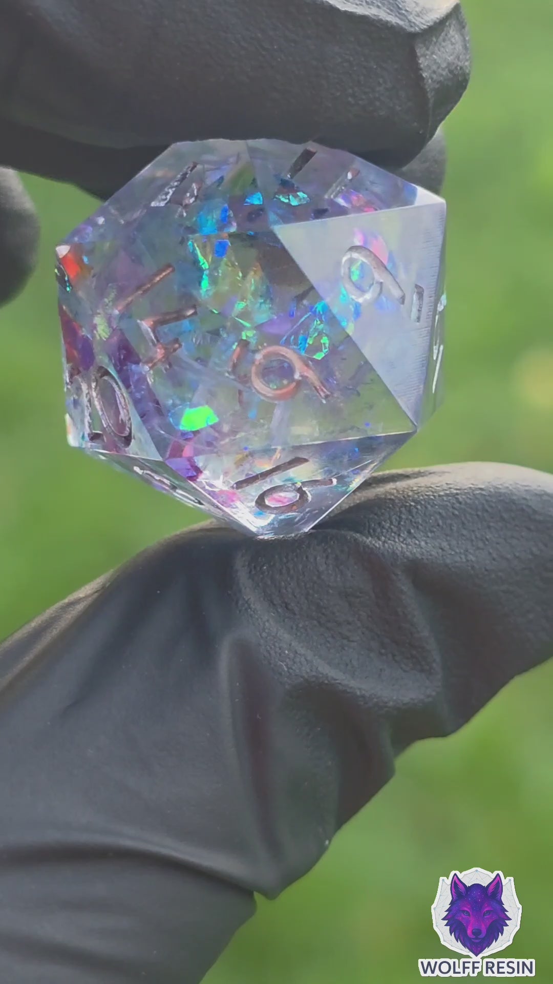 Dieser einzigartige D20 strahlt in irisierenden Farben – Blau, Violett, Türkis und einem Hauch von Gold reflektieren im klaren Harz, als würdest du in einen gefrorenen Sternenhimmel blicken.
