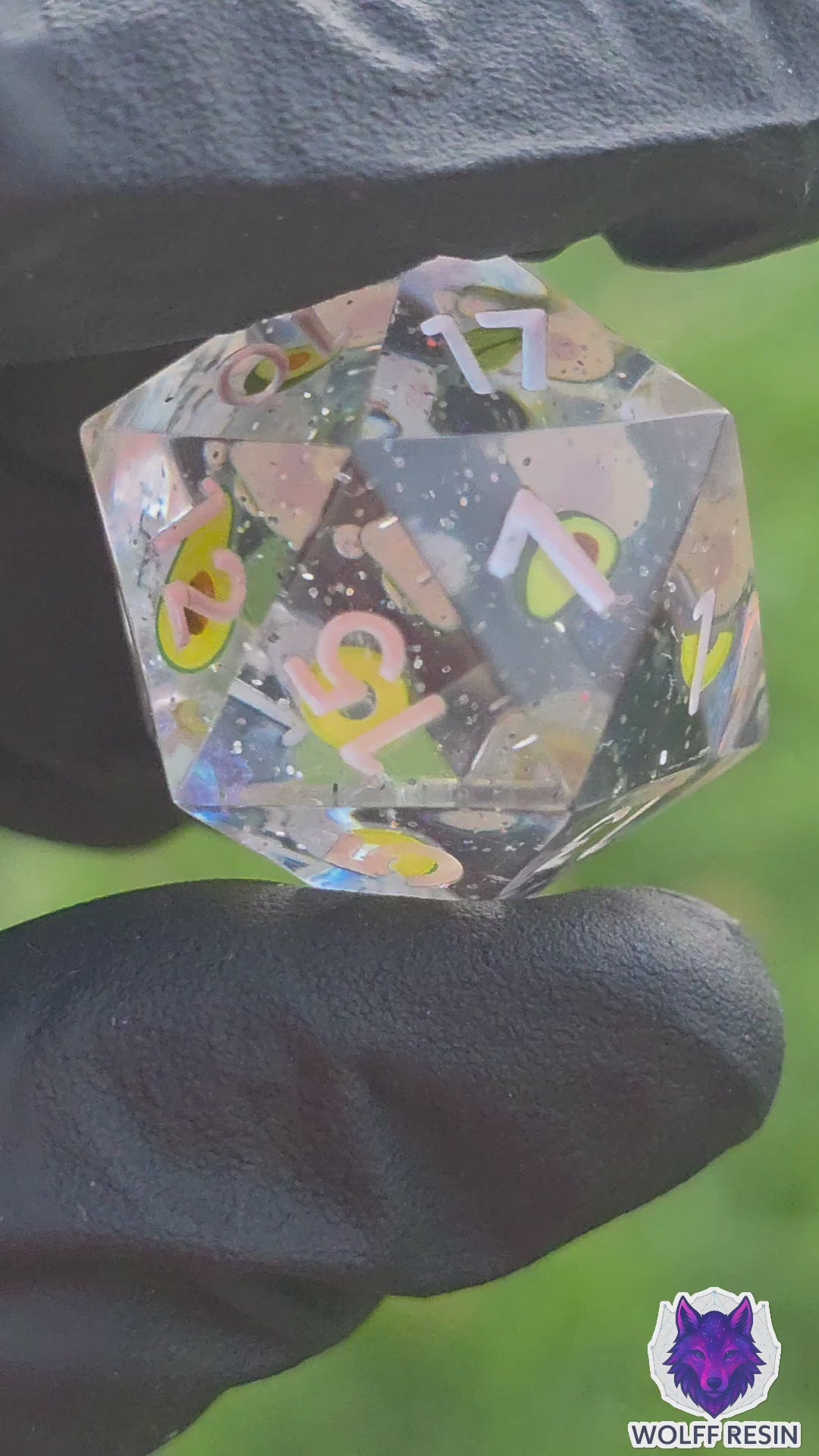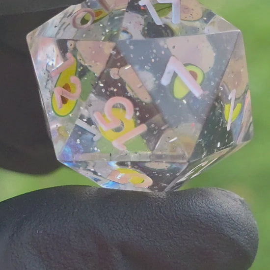 Dieser transparente D20 enthält kleine Avocado-Elemente, die in klarem Harz schweben – verspielt, originell und garantiert ein Blickfang bei jeder Session. 🌿