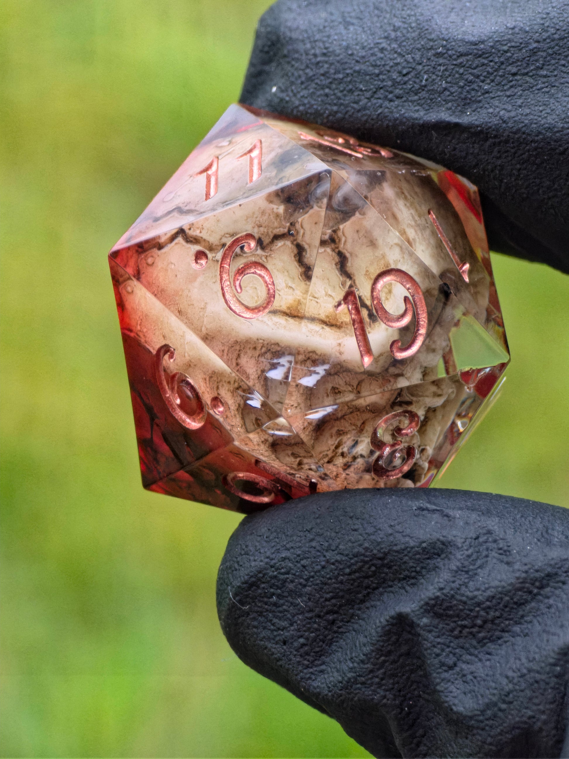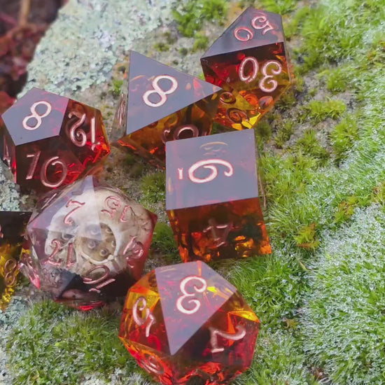 Ember Relic ist ein handgefertigtes 7-teiliges Polyedrisches Würfelset in tiefen Bernstein-, Kupfer- und Gluttönen. Die Würfel wirken wie aus erstarrtem Feuer geschmiedet: warm leuchtende Rot- und Orangeschichten treffen auf dunkle, rauchige Bereiche. Im Zentrum des Sets liegt ein außergewöhnlicher D20 mit einem realistisch gestalteten Schädel, eingefangen in klarem Harz – ein Artefakt, das sofort die Aufmerksamkeit auf sich zieht.