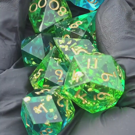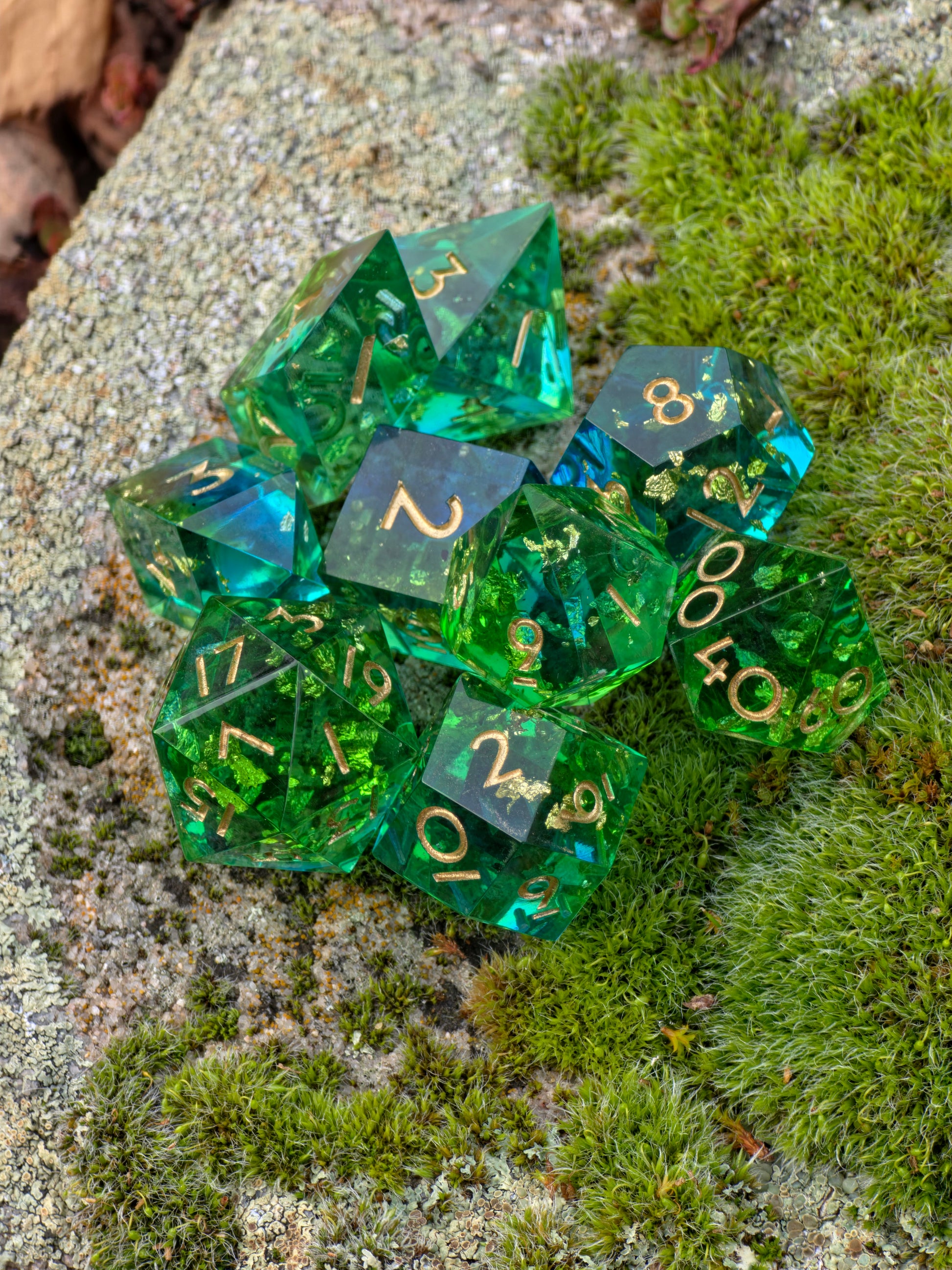 Handgemachtes Polyedrisches Würfelset „Emerald Tide“ – Grün Blau Resin Dice mit Goldflakes | DnD Dice Set | TTRPG | Pen and Paper | Transparent Magic Dice