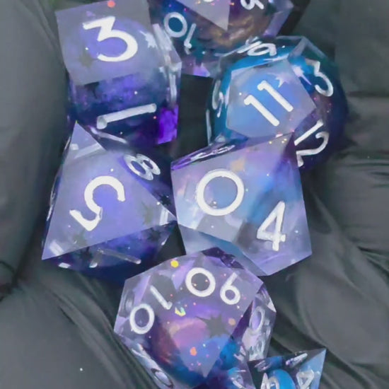 Jeder Würfel enthält eine handgefertigte Mini-Planetenkugel, umgeben von violett-blauen Nebeln, glitzernden Sternen und silbernen Zahlen. Perfekt für Sammler*innen und Fantasy-Spieler, die etwas wirklich Besonderes suchen. 💎