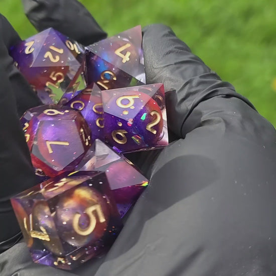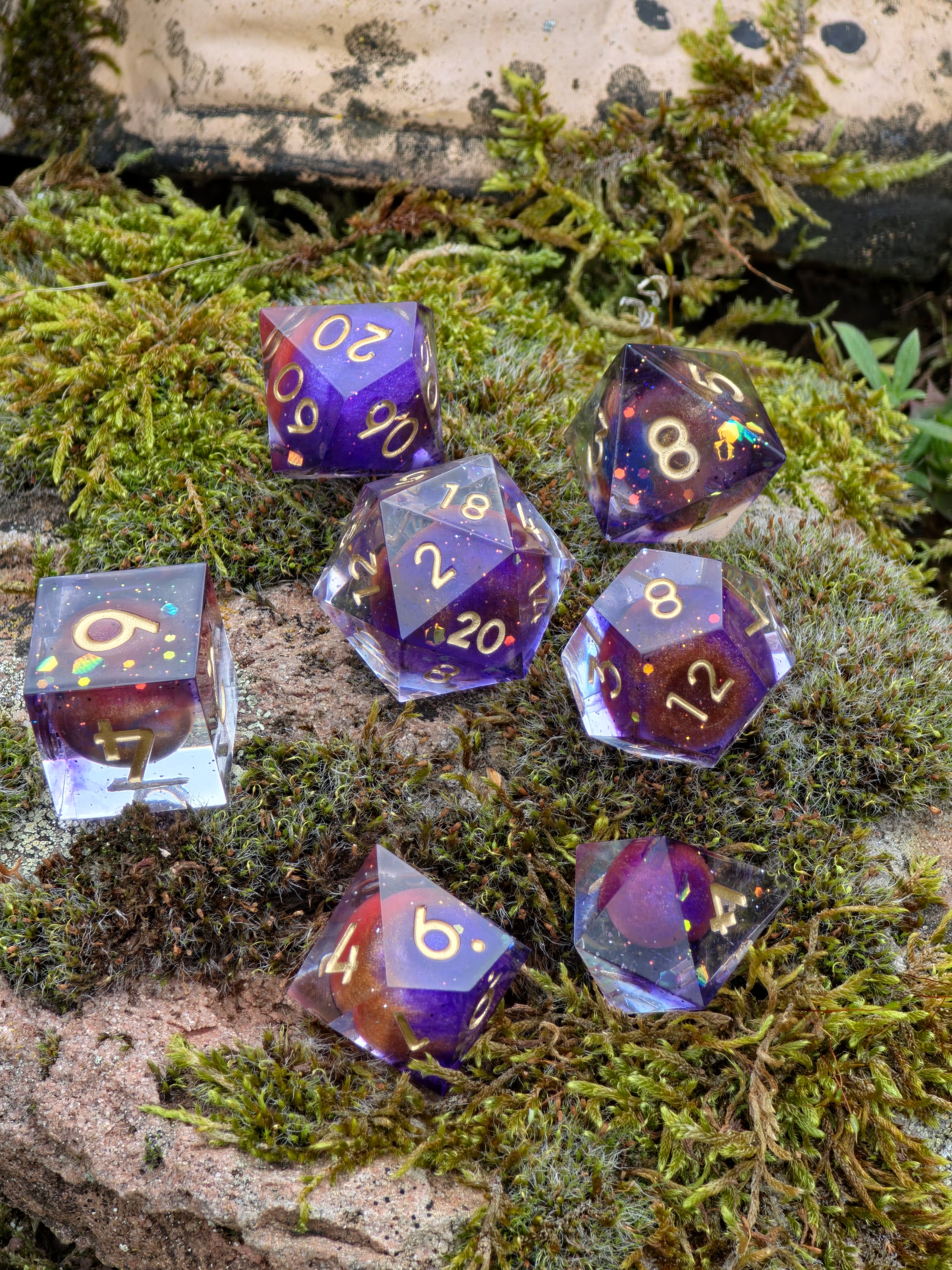 Polyedrischer Planeten Kosmos DnD Würfelset 7 Stück – Handgemachte Resin Dice mit Universum-Effekt & goldenen Zahlen | Galaxy Fantasy Würfel