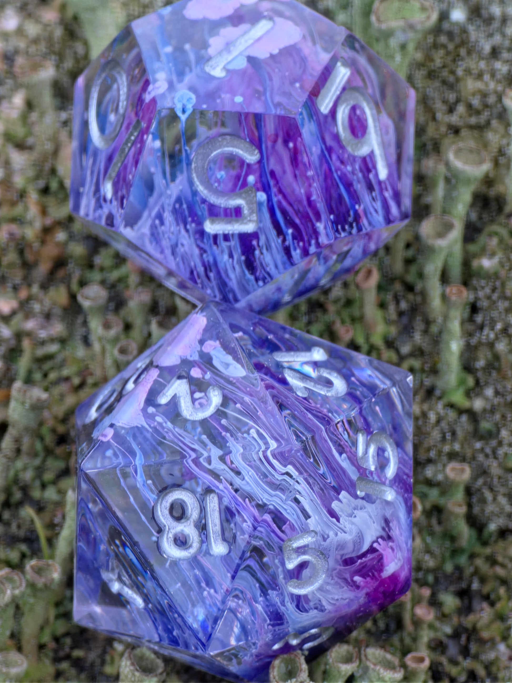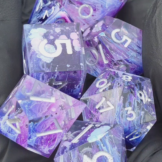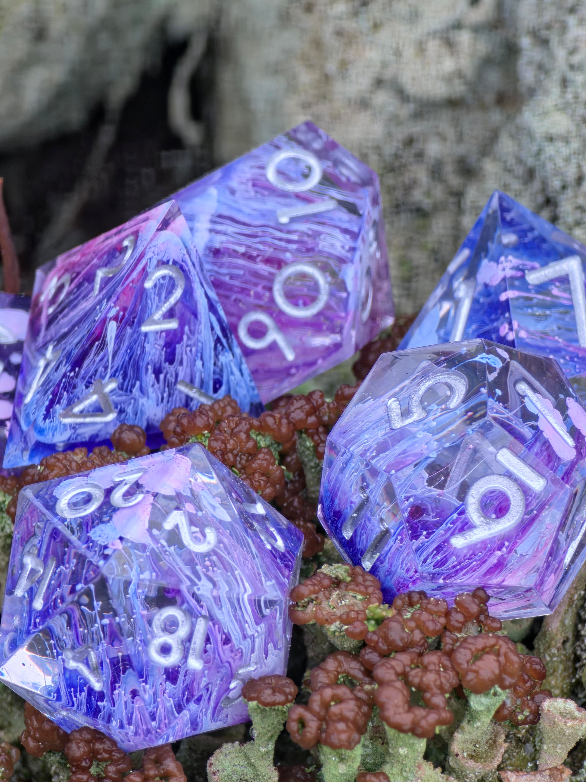Nebula Bloom ist ein handgefertigtes 7-teiliges DnD Würfelset, geprägt von einem dynamischen violett-blauen Farbspektrum und überlagerten Petri-Strukturen. Feine weiße und rosa Einschlüsse wirken wie neonartige Blüten, die sich im Inneren entfalten, während silberne Zahlen das Licht subtil reflektieren.