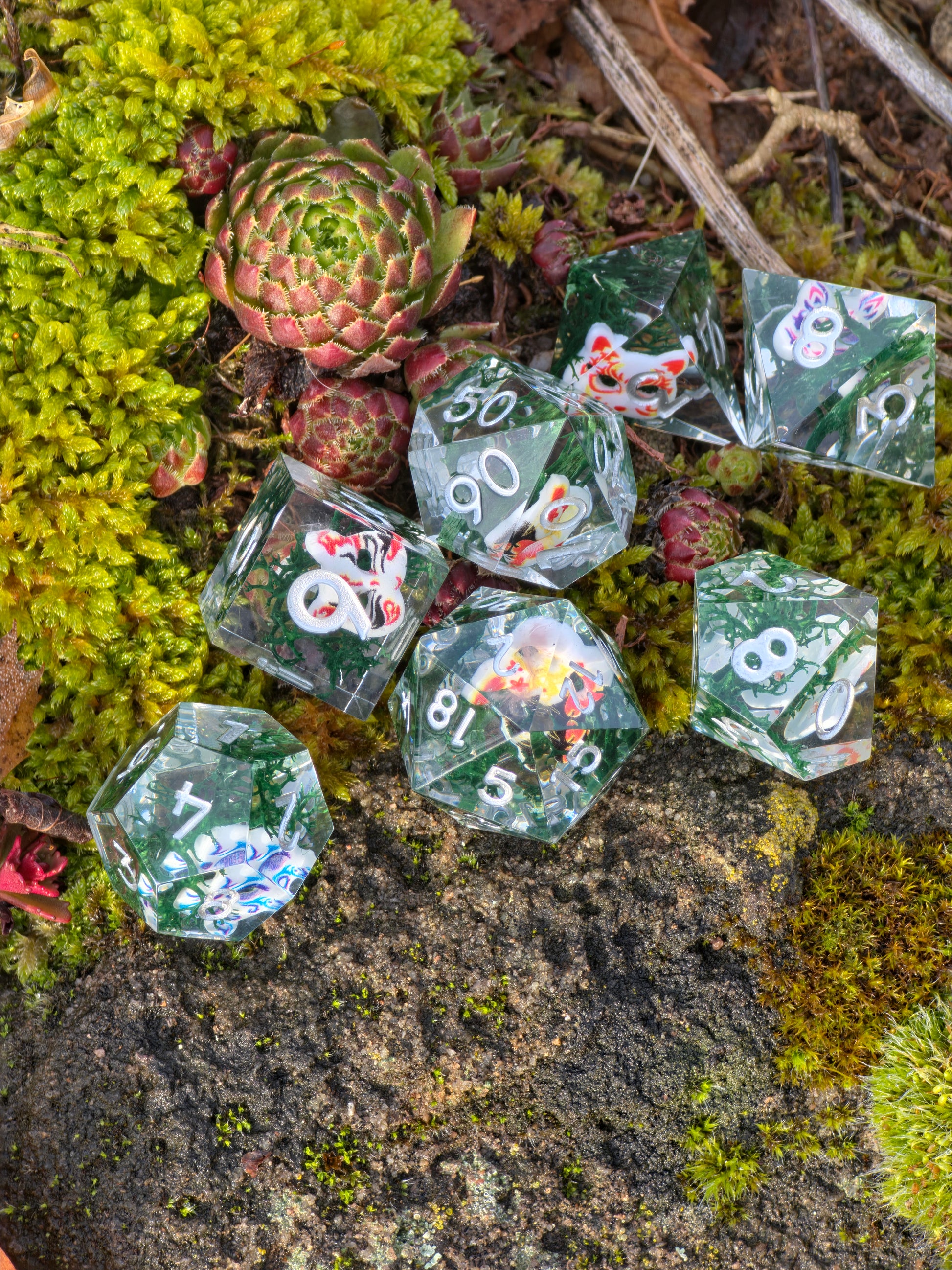 Oni Curse Dice – Japanische Dämonen Masken Würfelset | Klar Resin DnD Dice Set mit weißen Zahlen | Handmade TTRPG Würfel