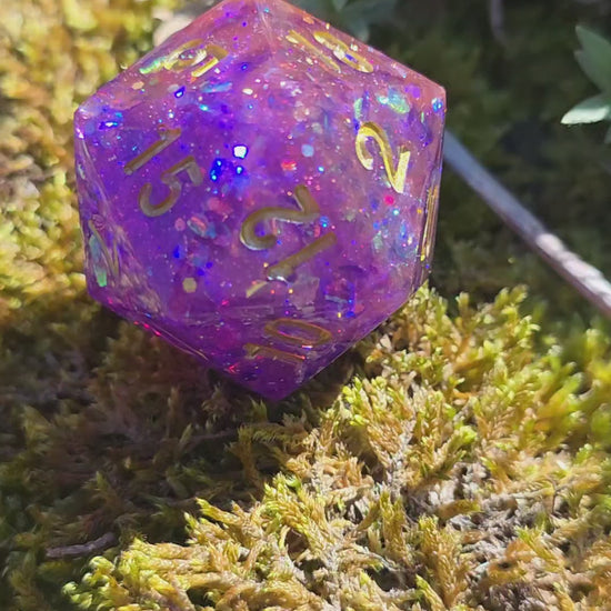 Polyedrischer D20 Würfel 35mm – L Format Chonk Dice | Handgemachter RPG Würfel in Violett Rosa mit Galaxy Schimmer & Goldzahlen für DnD