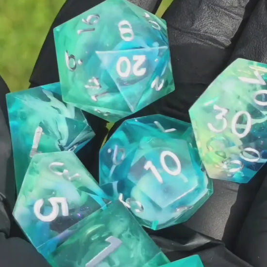Polyedrischer DnD Würfelset 7 Stück – Ocean Mist Cloud Dice | Handgemachte Resin Würfel in Blau Türkis Zitronen Transparent mit Cloud-Effekt