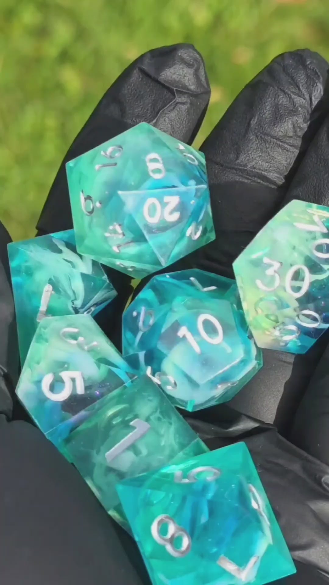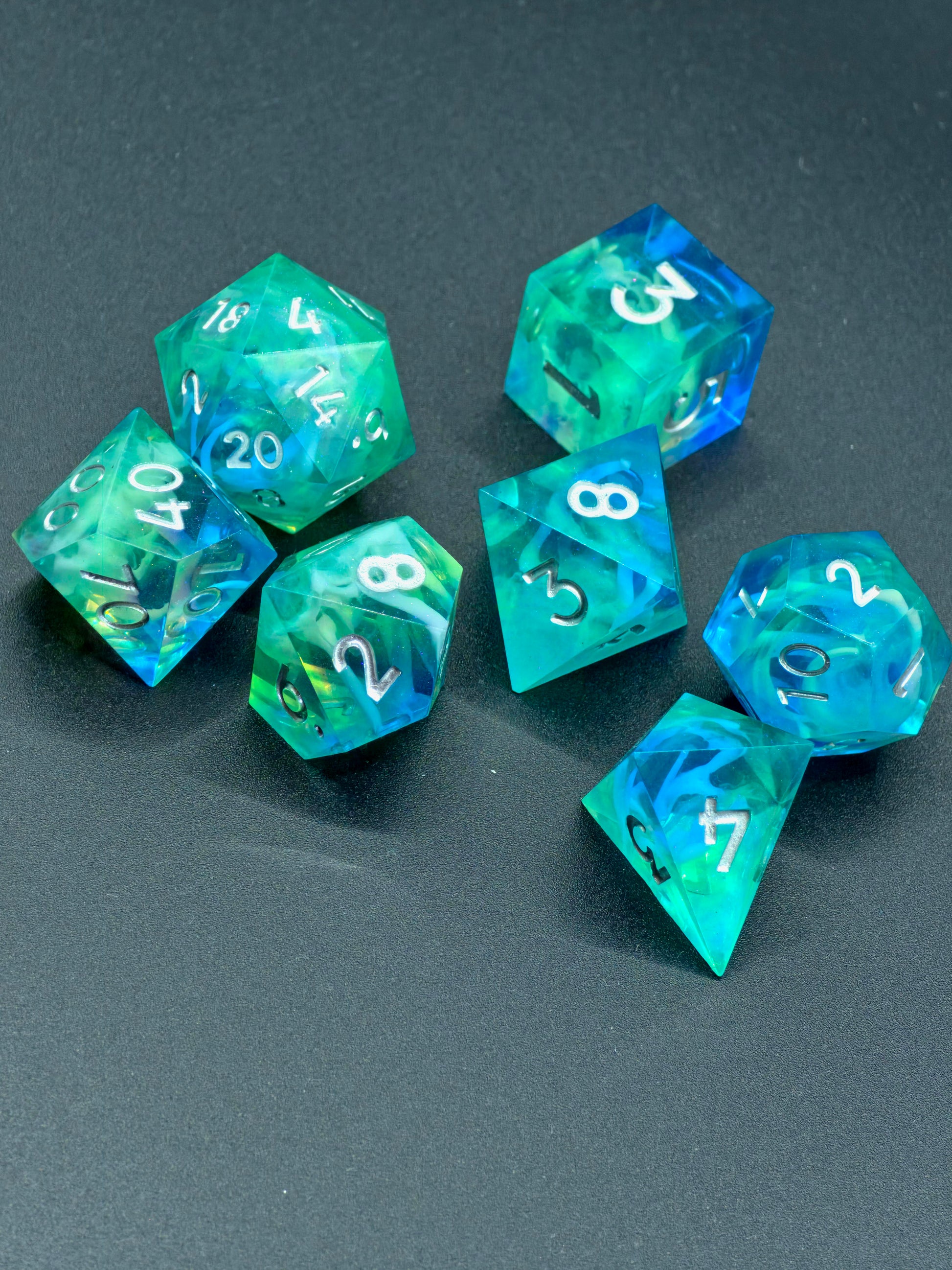 🌊 Dieses handgefertigte DnD-Würfelset bringt die Farben des Ozeans und des Himmels zusammen – Blau, Türkis und ein Hauch von Zitronenlicht verschmelzen zu einem leuchtenden Nebel im Inneren jedes Würfels.
