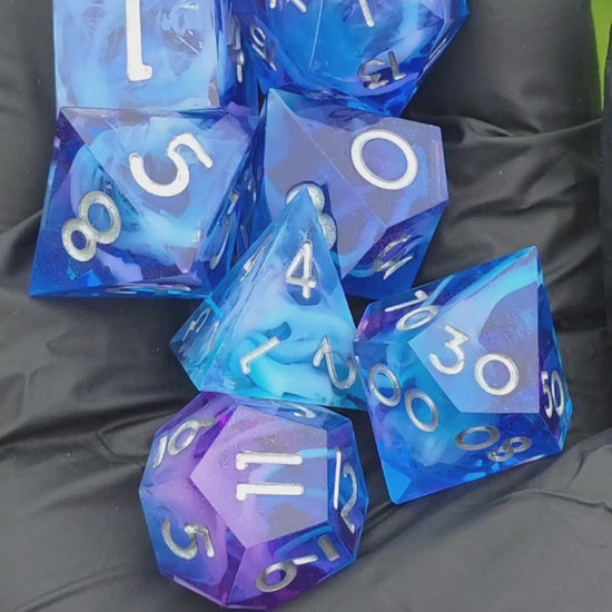 Polyedrisches Aurora Nebula DnD Würfelset 7 Stück – Mystic Sky Dice | Handgemachte Resin Würfel in Blau Lila Rosa mit Cloud Effekt | TTRPG D