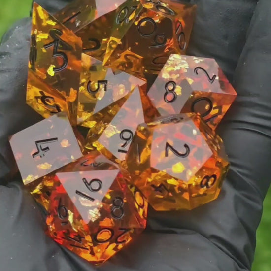 Polyedrisches DnD-Würfelset 9 Stück – Amber Bernstein Dice Set | Handgemachte Resin Würfel in Gold Orange Transparent | Kristall & Raute