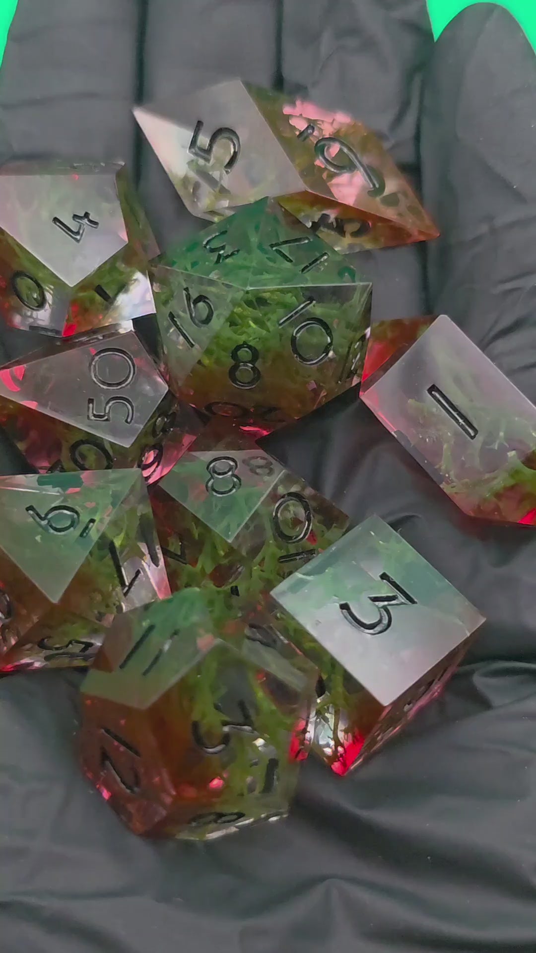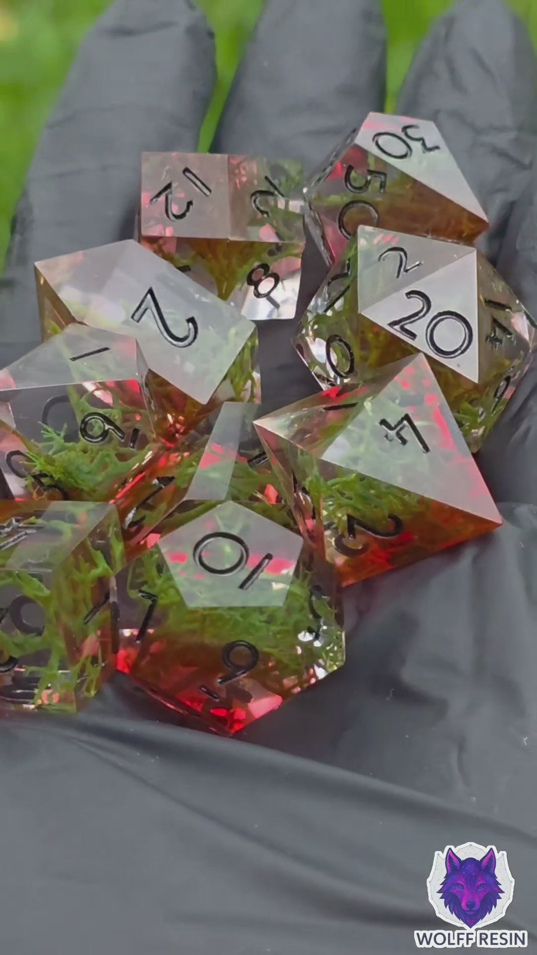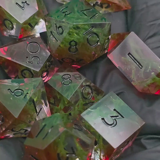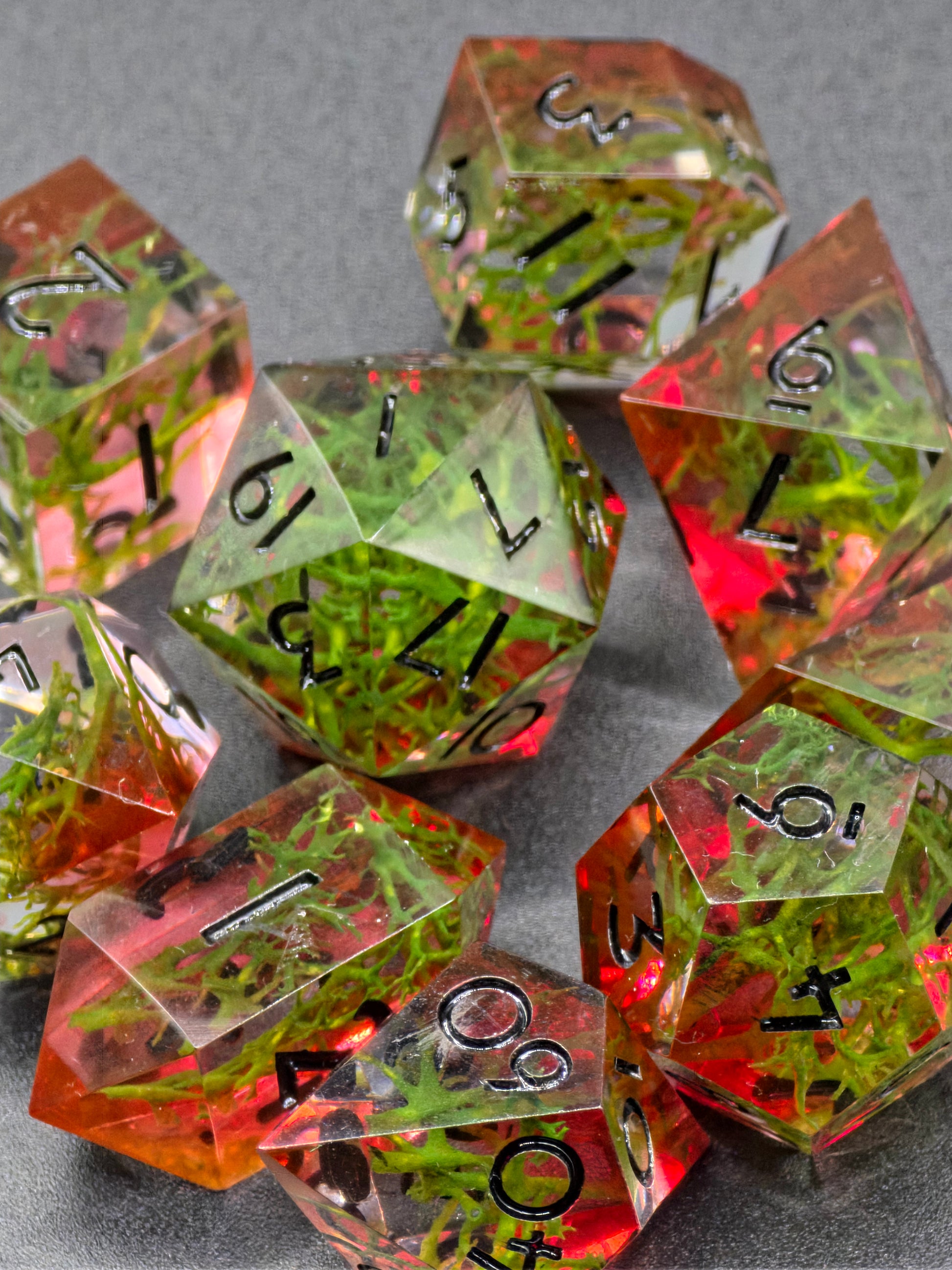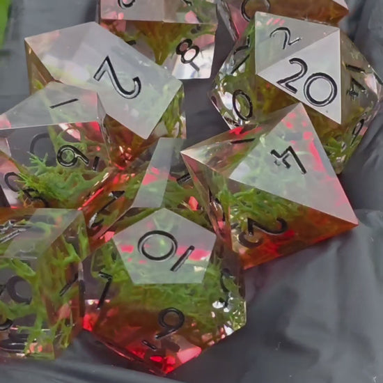 Polyedrisches DnD Würfelset Forest Ember – Handgemachte Resinwürfel mit Moos & rötlichem Lichtschein | DnD Pen and Paper TTRPG