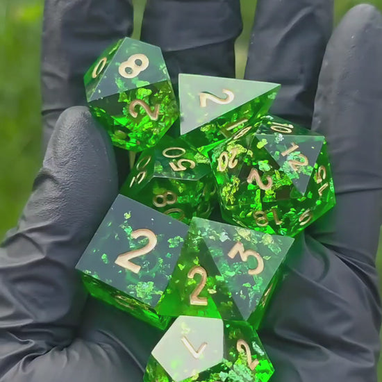 Polyedrisches DnD Würfelset Smaragdgrün – Handgemachte Resinwürfel mit Goldflocken | DnD Pen and Paper TTRPG | Edelstein Effekt Set