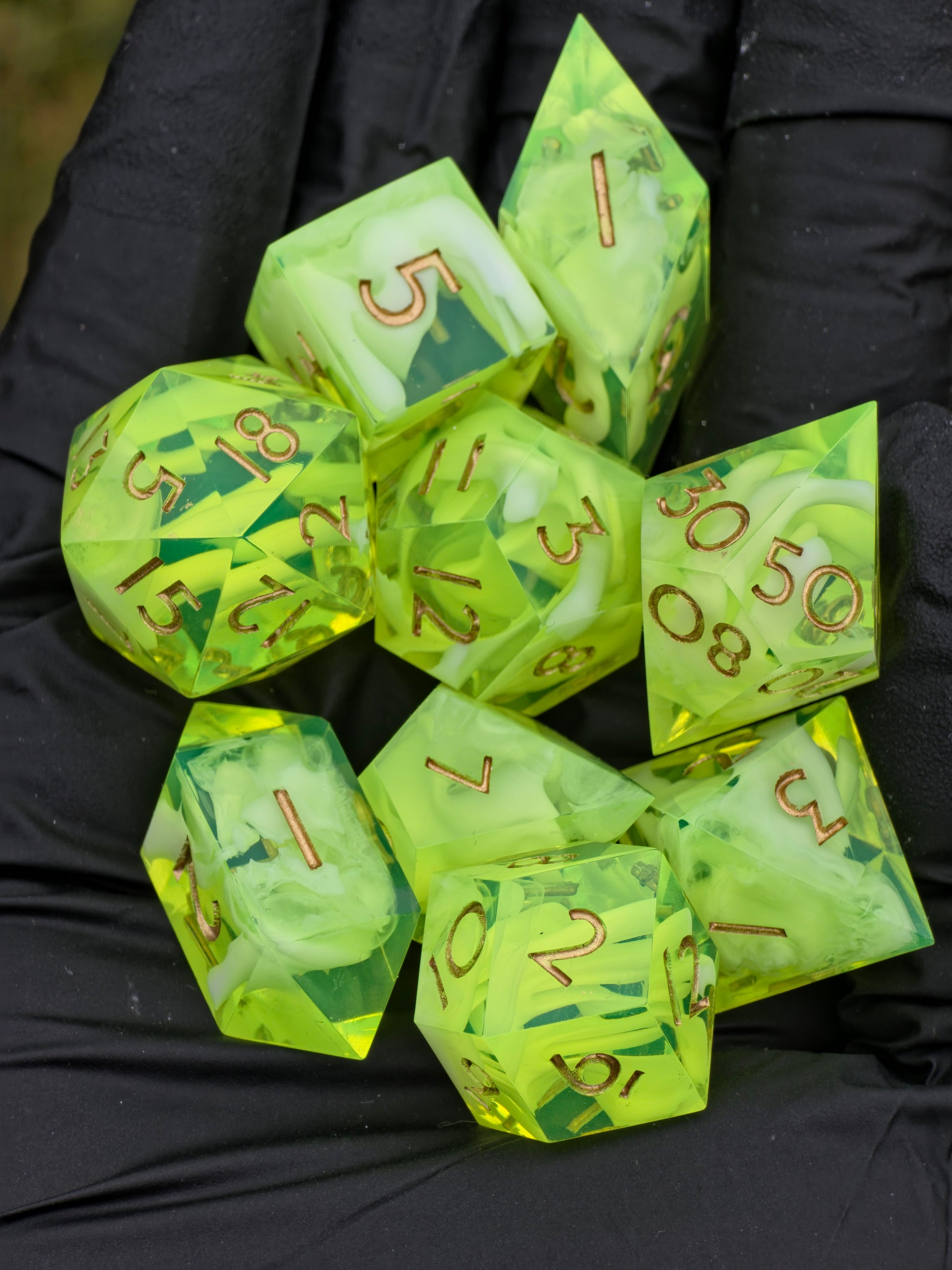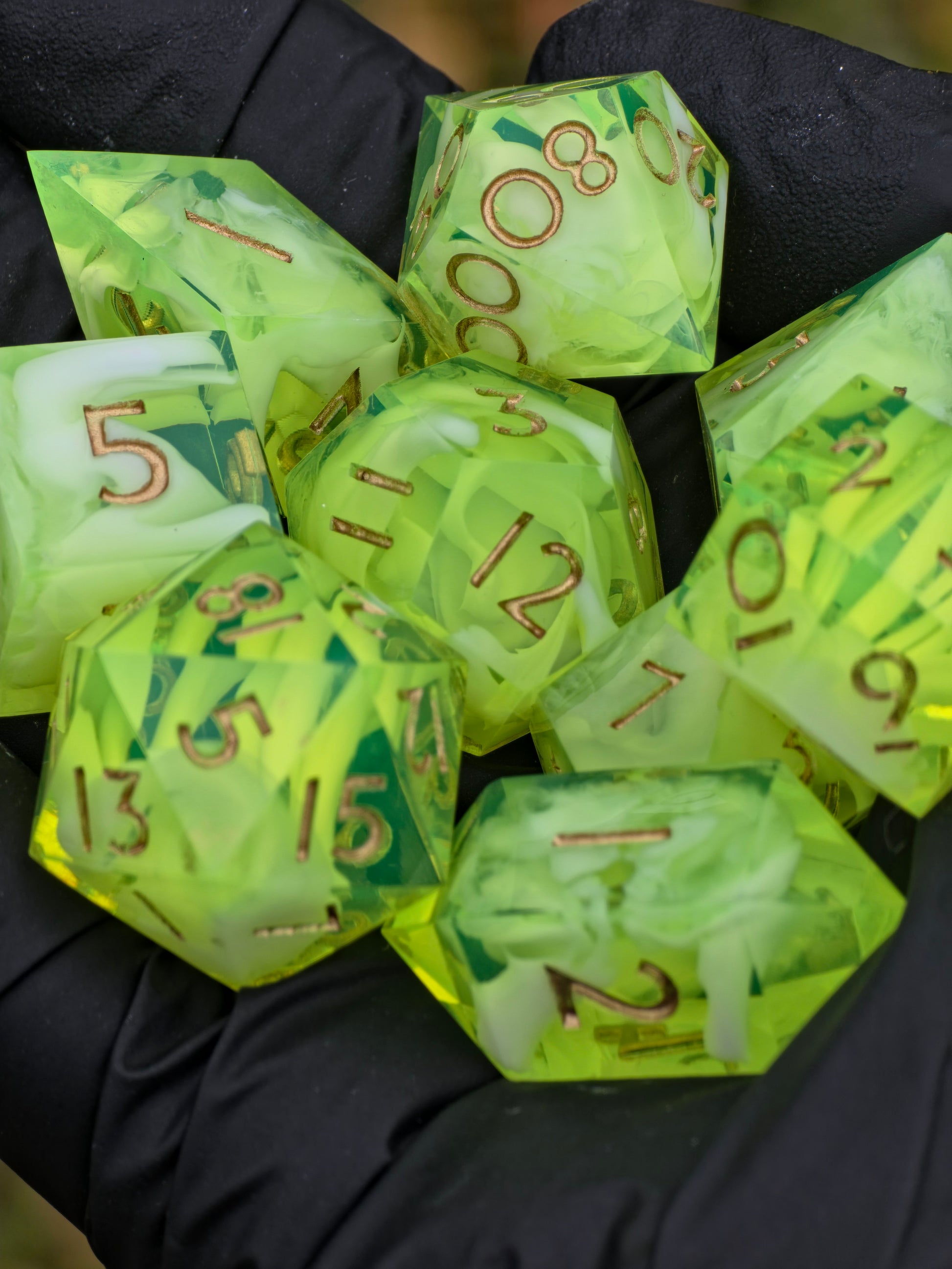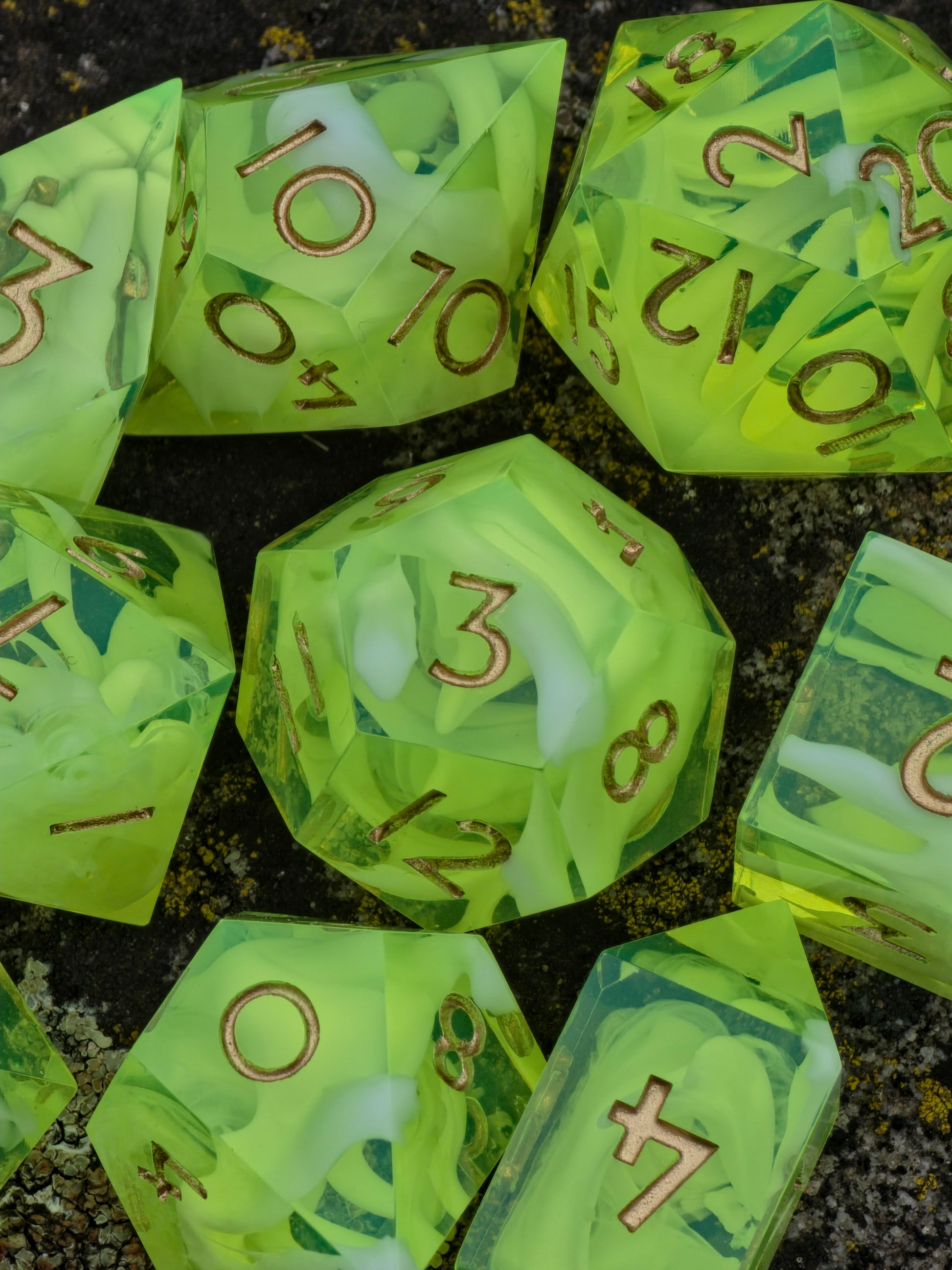 Polyedrisches Würfelset „Alchemist Cloud Nebula“ – Handgemachte Resinwürfel mit Cloud-Effekt & Goldzahlen | DnD Dice Set TTRPG