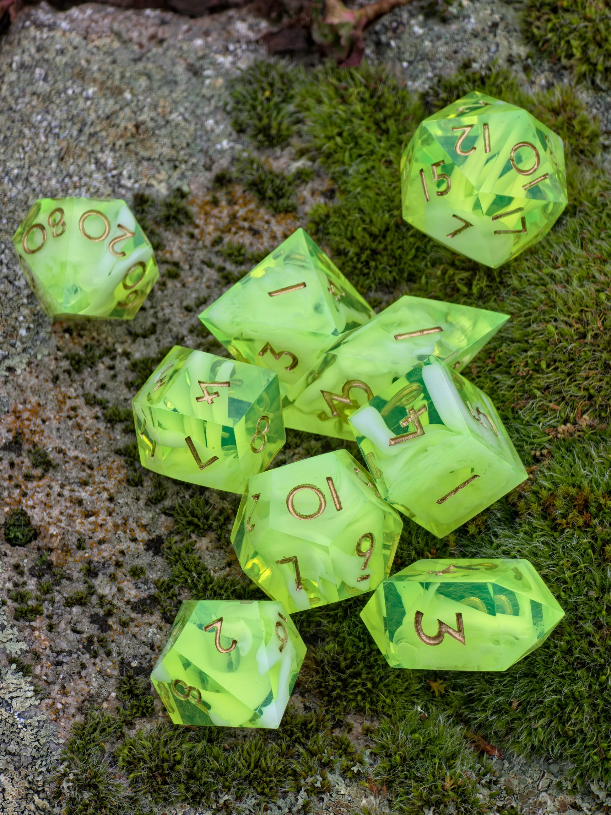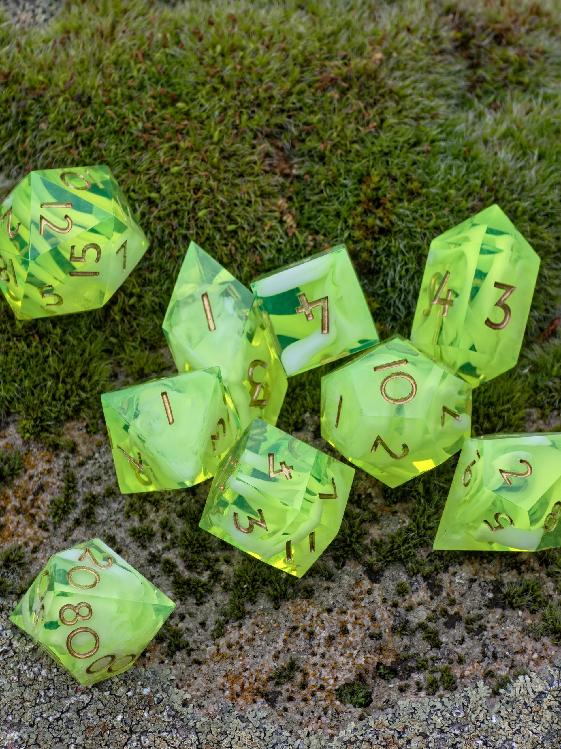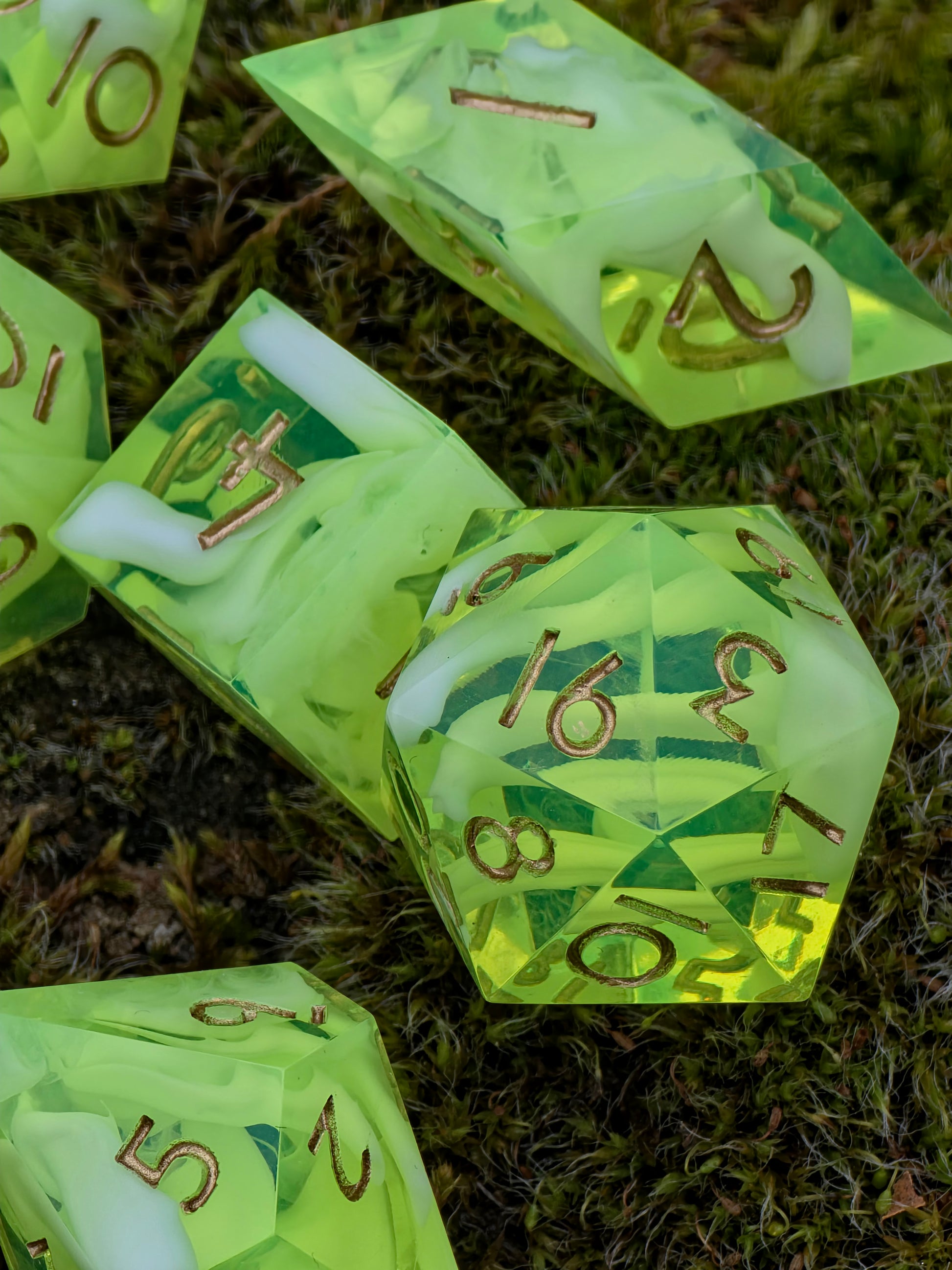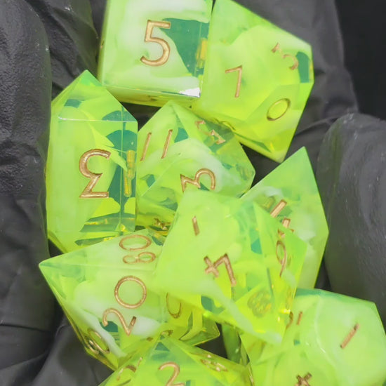 Polyedrisches Würfelset „Alchemist Cloud Nebula“ – Handgemachte Resinwürfel mit Cloud-Effekt & Goldzahlen | DnD Dice Set TTRPG