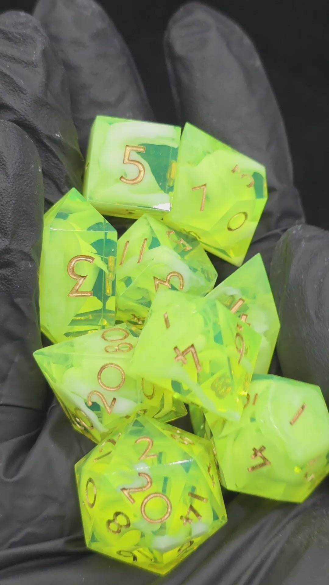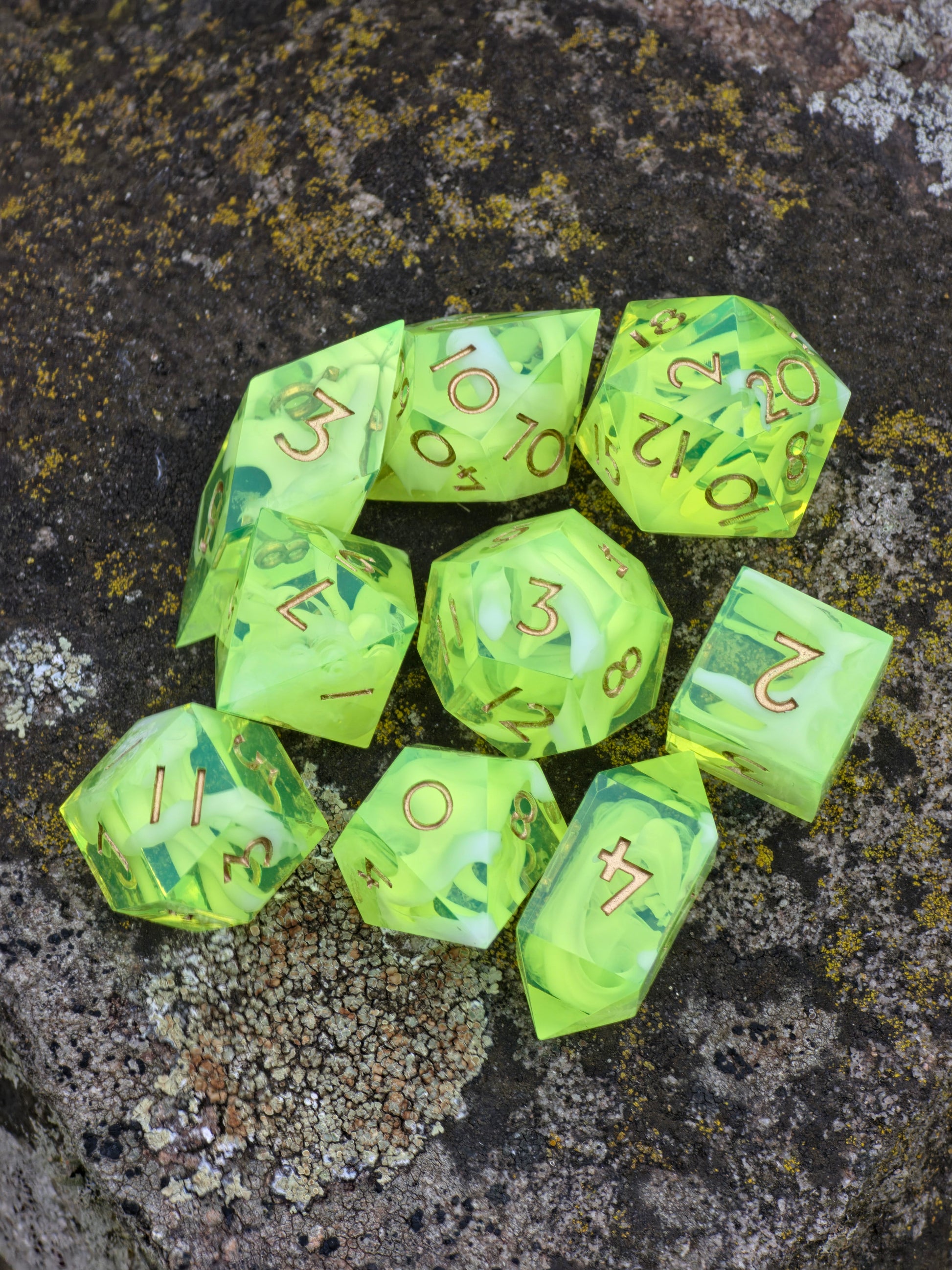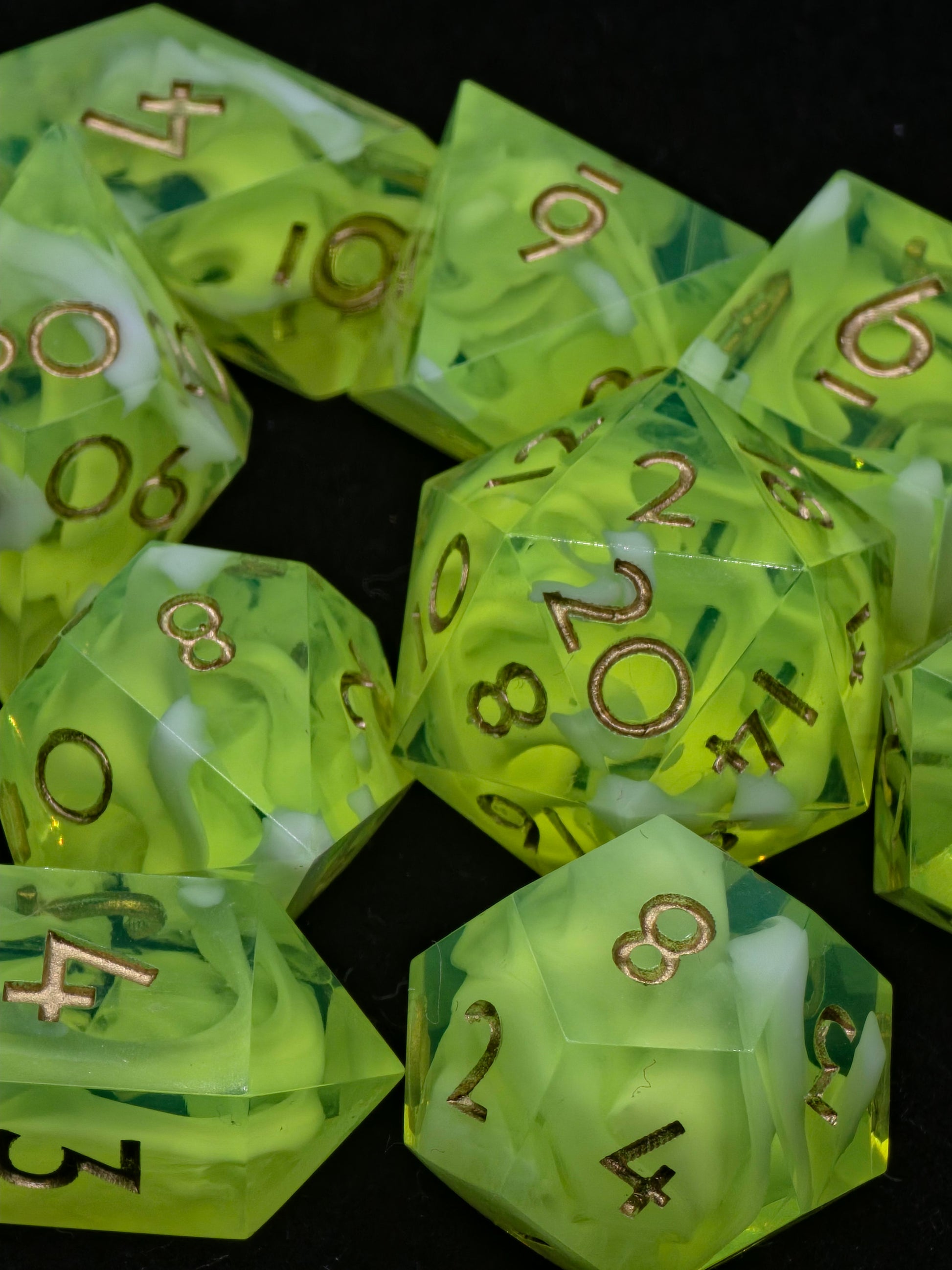 Handgefertigtes Resinwürfelset mit wolkenartigen Wirbeln und klarer Tiefenstruktur.