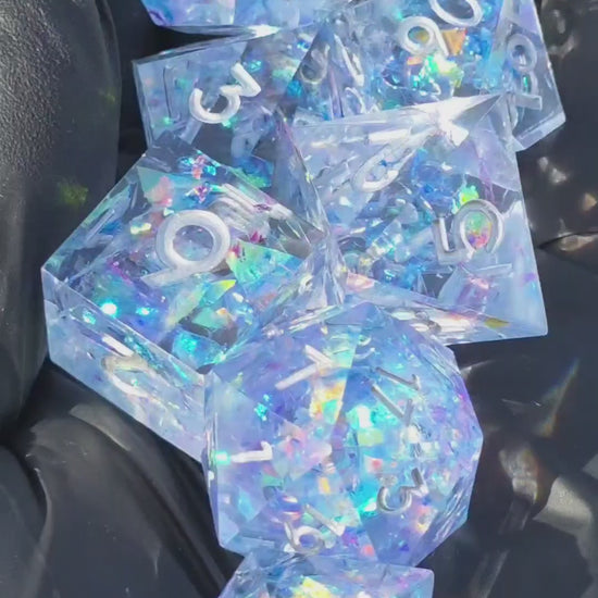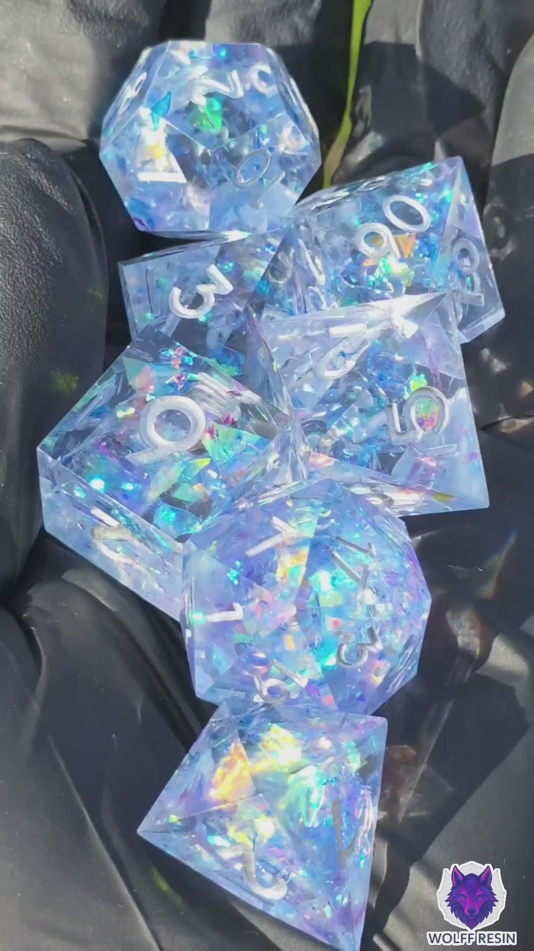Polyedrisches Würfelset „Frozen Aurora“ – Handgemachte Resinwürfel mit Eisblau-Opal Effekt | DnD Dice Set Pen and Paper TTRPG | Gefrorenes Nordlicht Würfelset