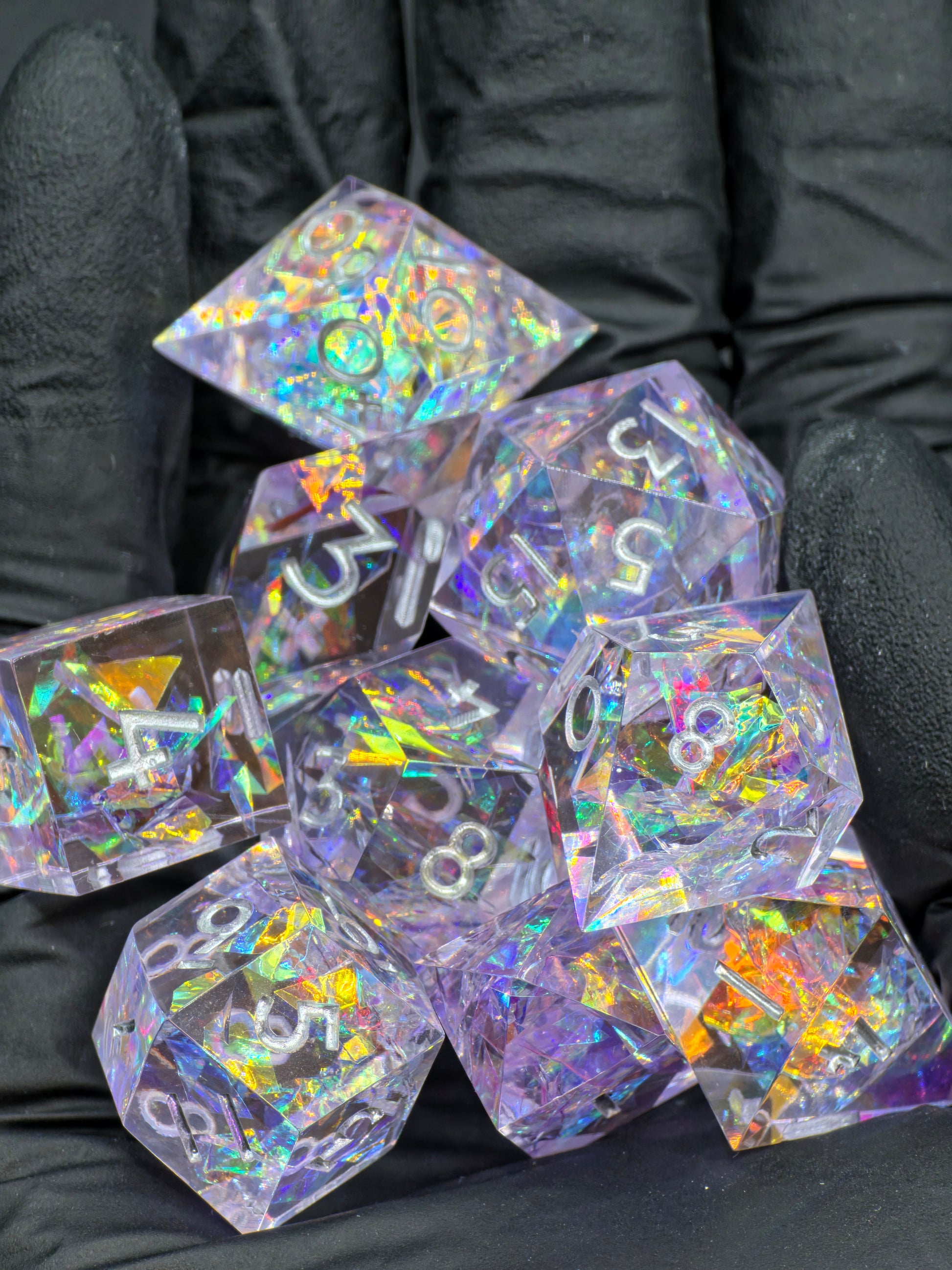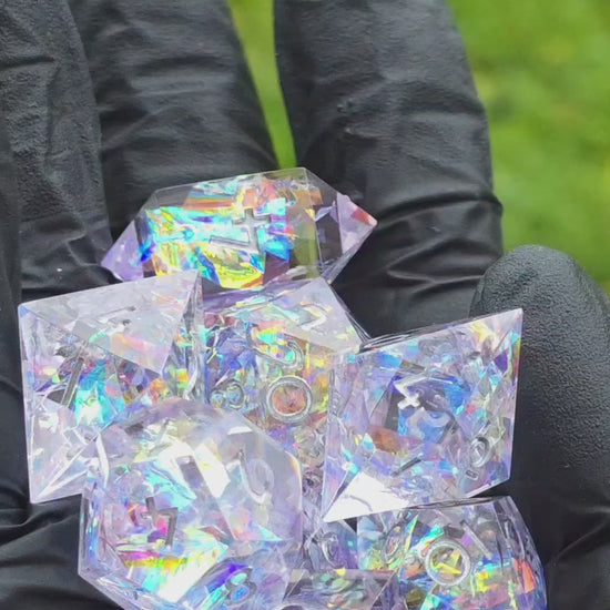 Polyedrisches Würfelset „Prism Aurora“ – Handgemachte Resinwürfel mit irisierendem Opal-Effekt | DnD Dice Set Pen and Paper TTRPG | Regenbogenwürfel mit Spiegelglanz