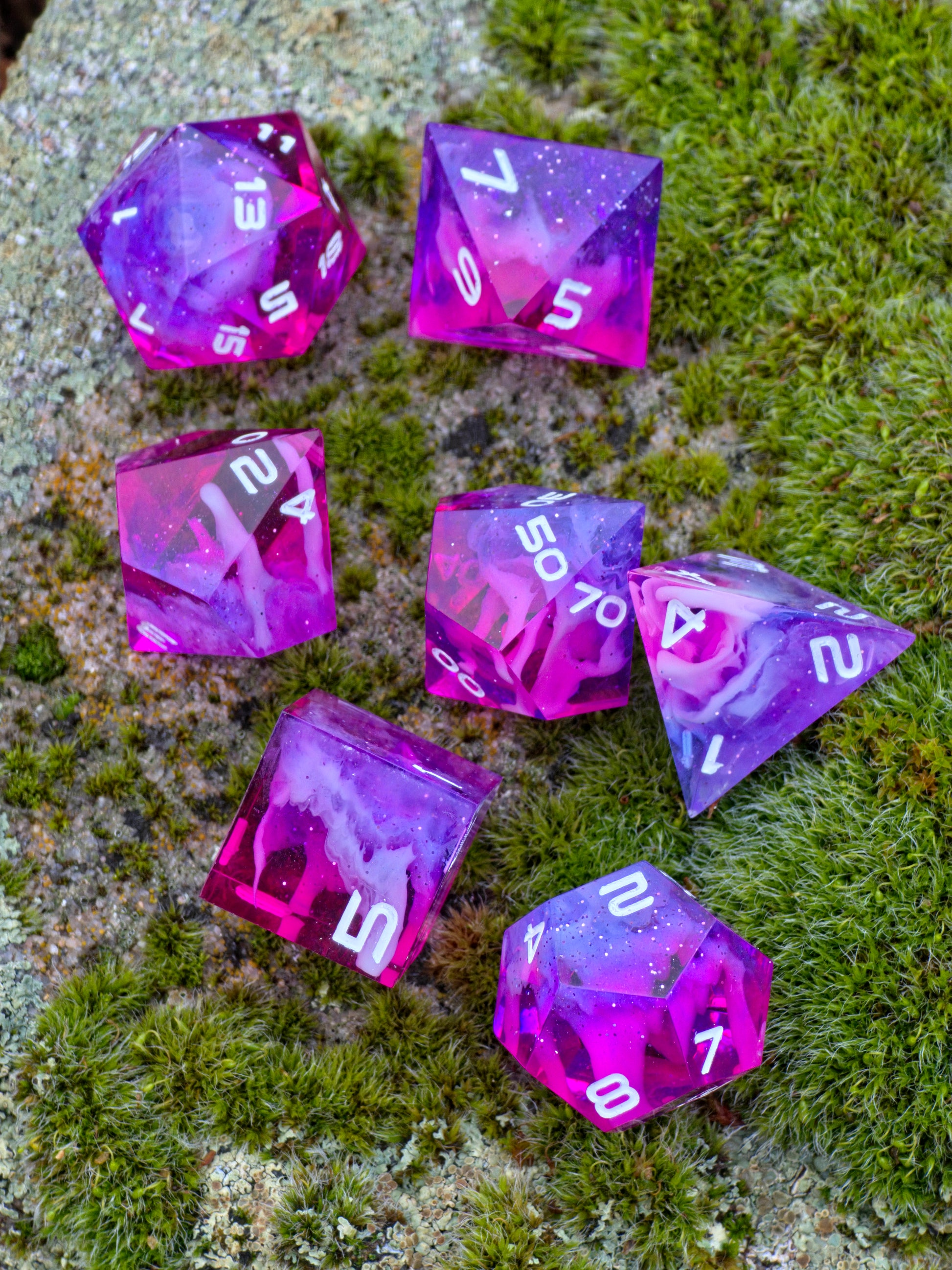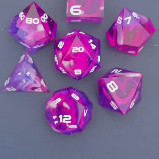 Polyedrisches Würfelset „Starflare Cloud Galaxy“ – Handgemachte Resinwürfel pink-violett mit Galaxy & Cloud Nebula Effekt | DnD Dice Set TTRPG