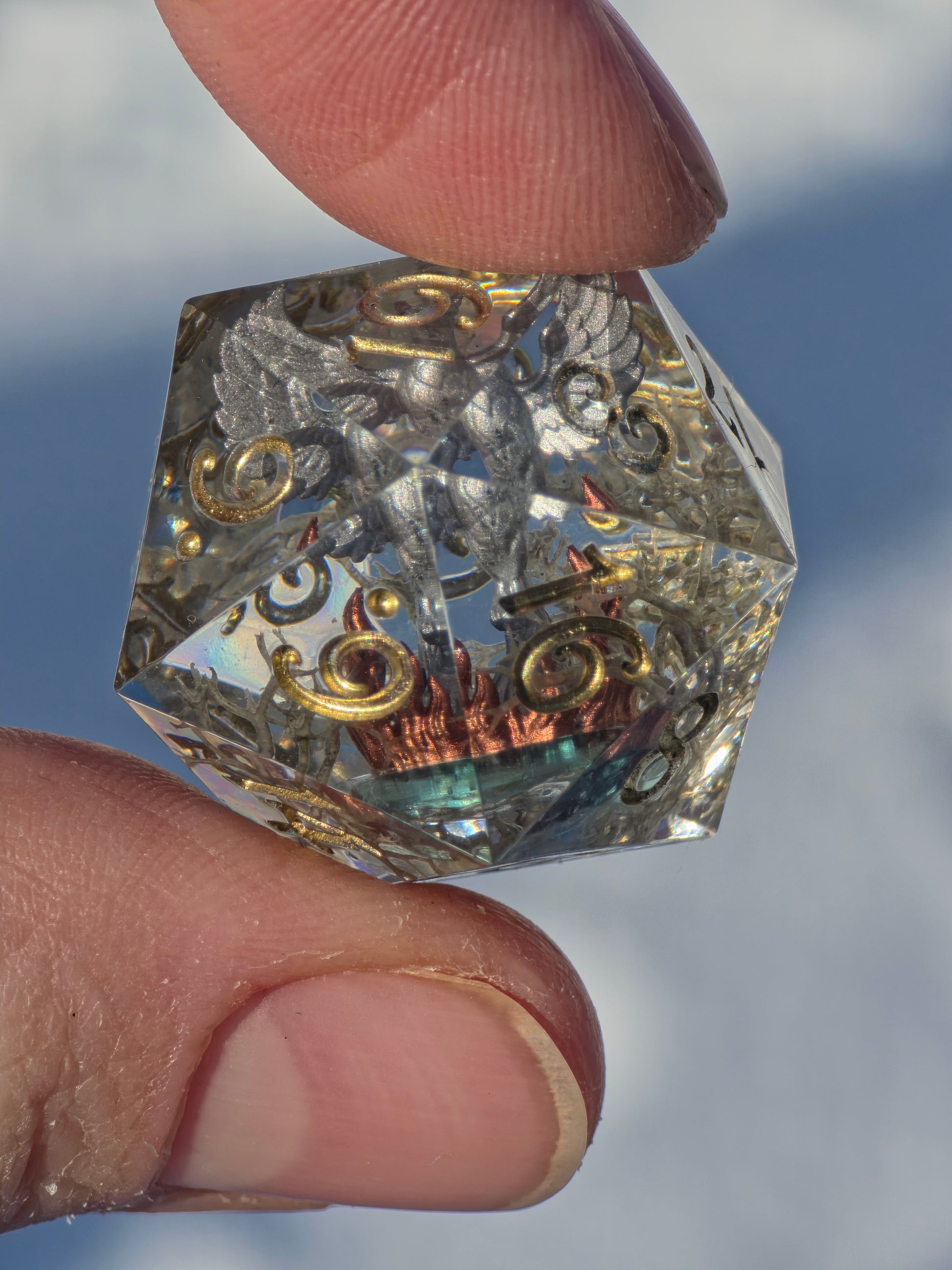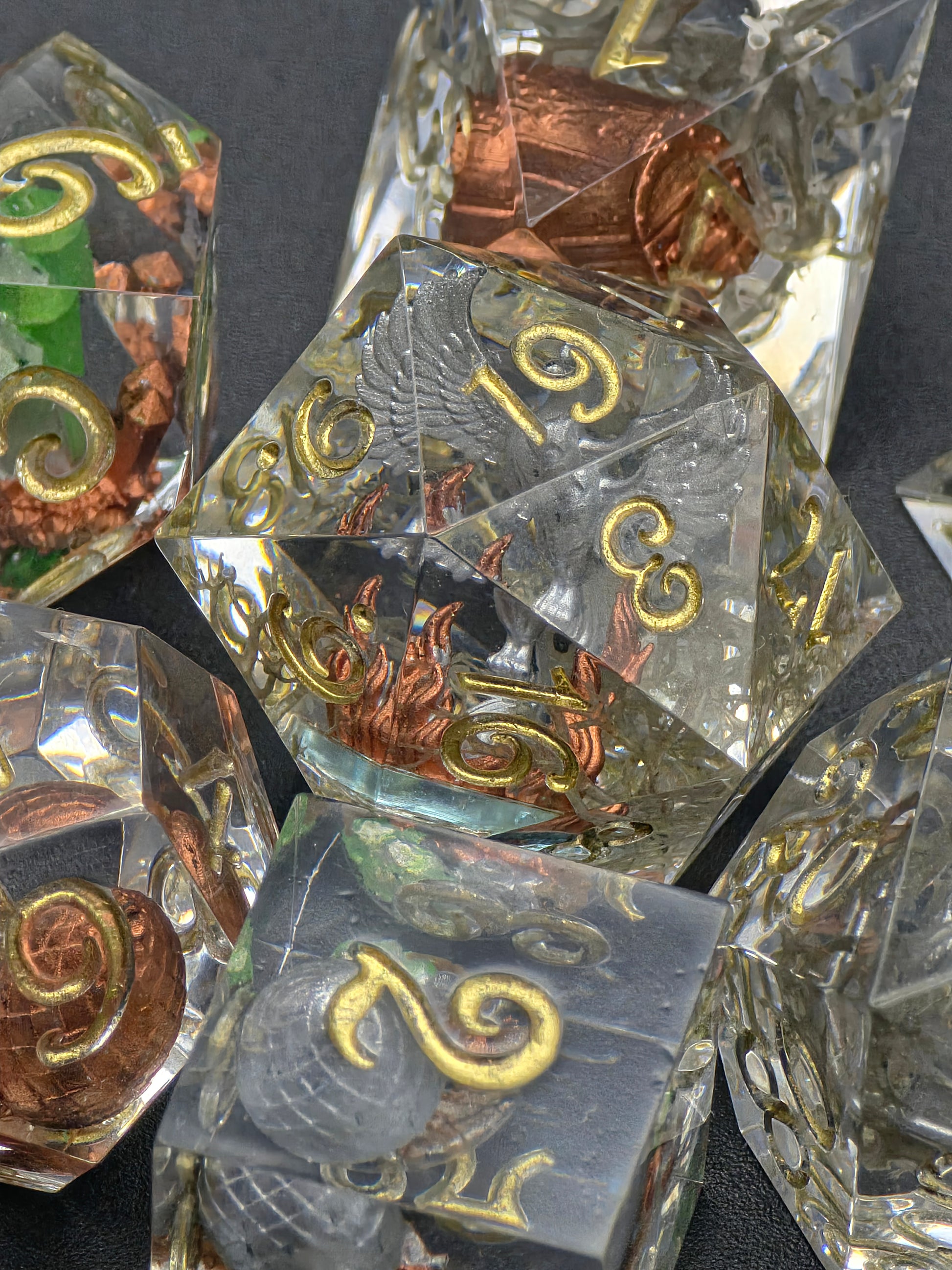 Würfelset „Asche des Ewigen Feuers“ – Handgemachtes Resin Dice Set mit Silbernem Phönix, Eiern & Kristallen | DnD TTRPG Würfel
