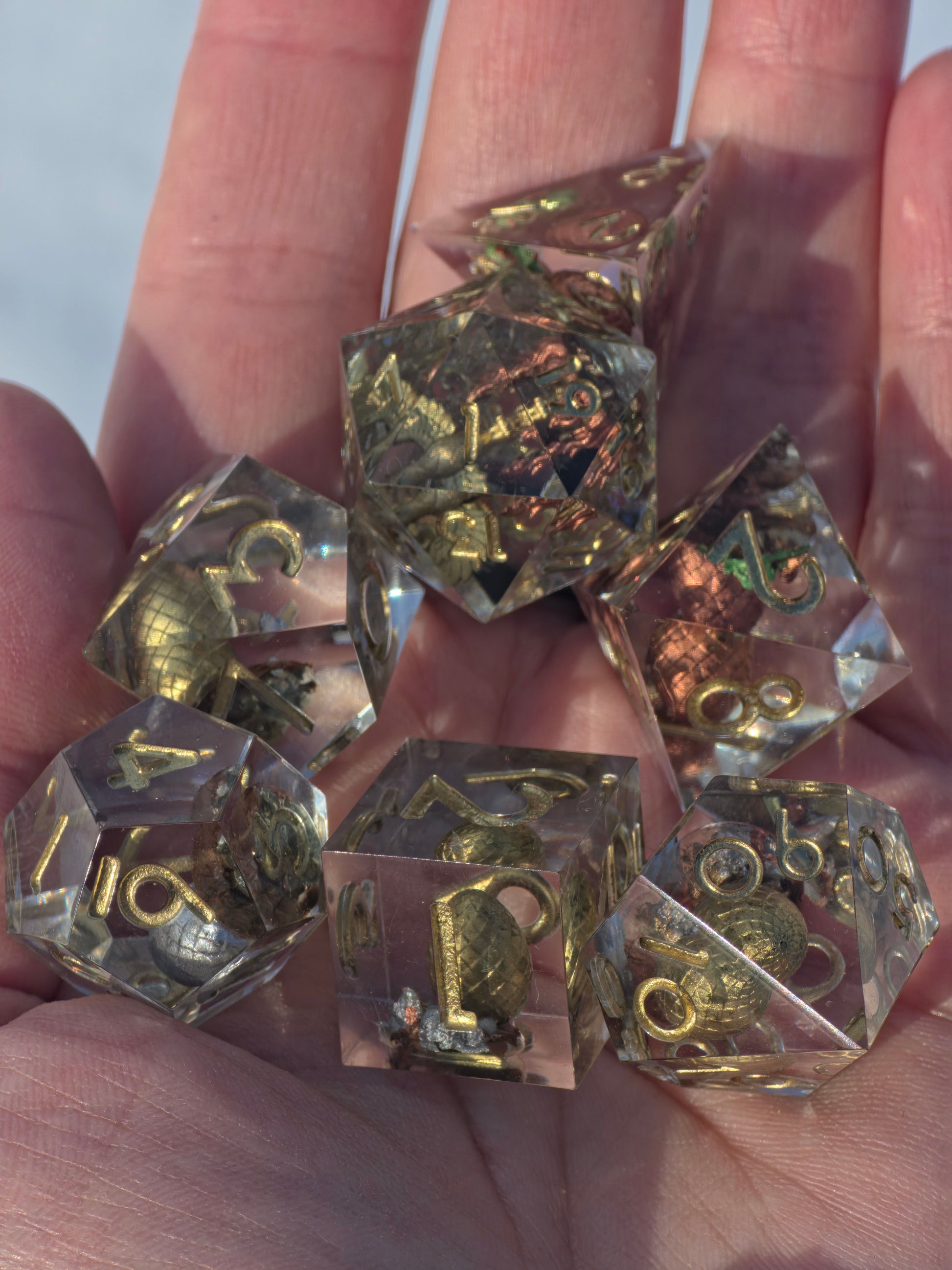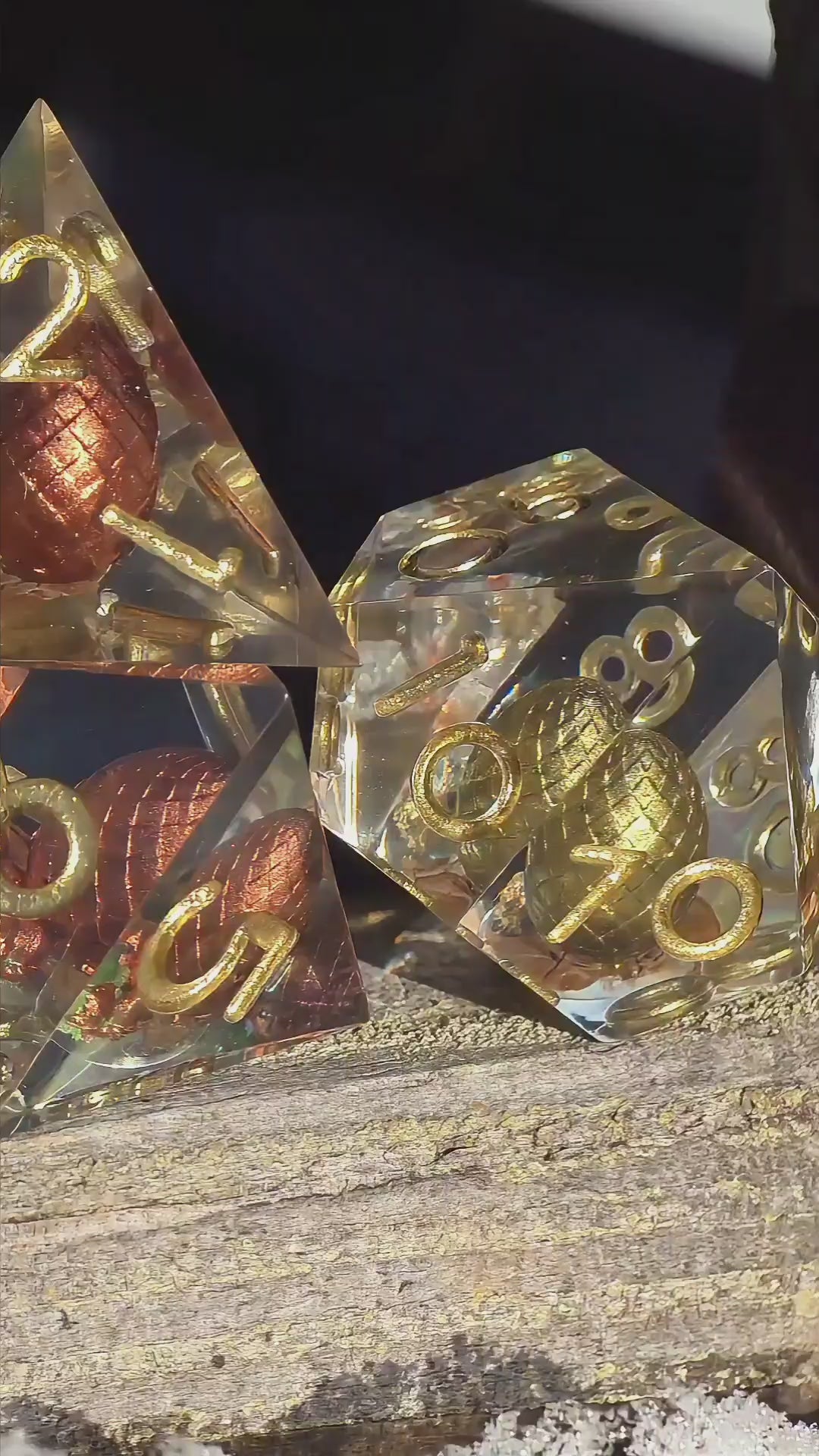 Würfelset „Goldene Wiederkehr“ – Handgemachtes Resin Dice Set mit Goldenem Phönix & Phönix-Eiern | DnD TTRPG Würfel