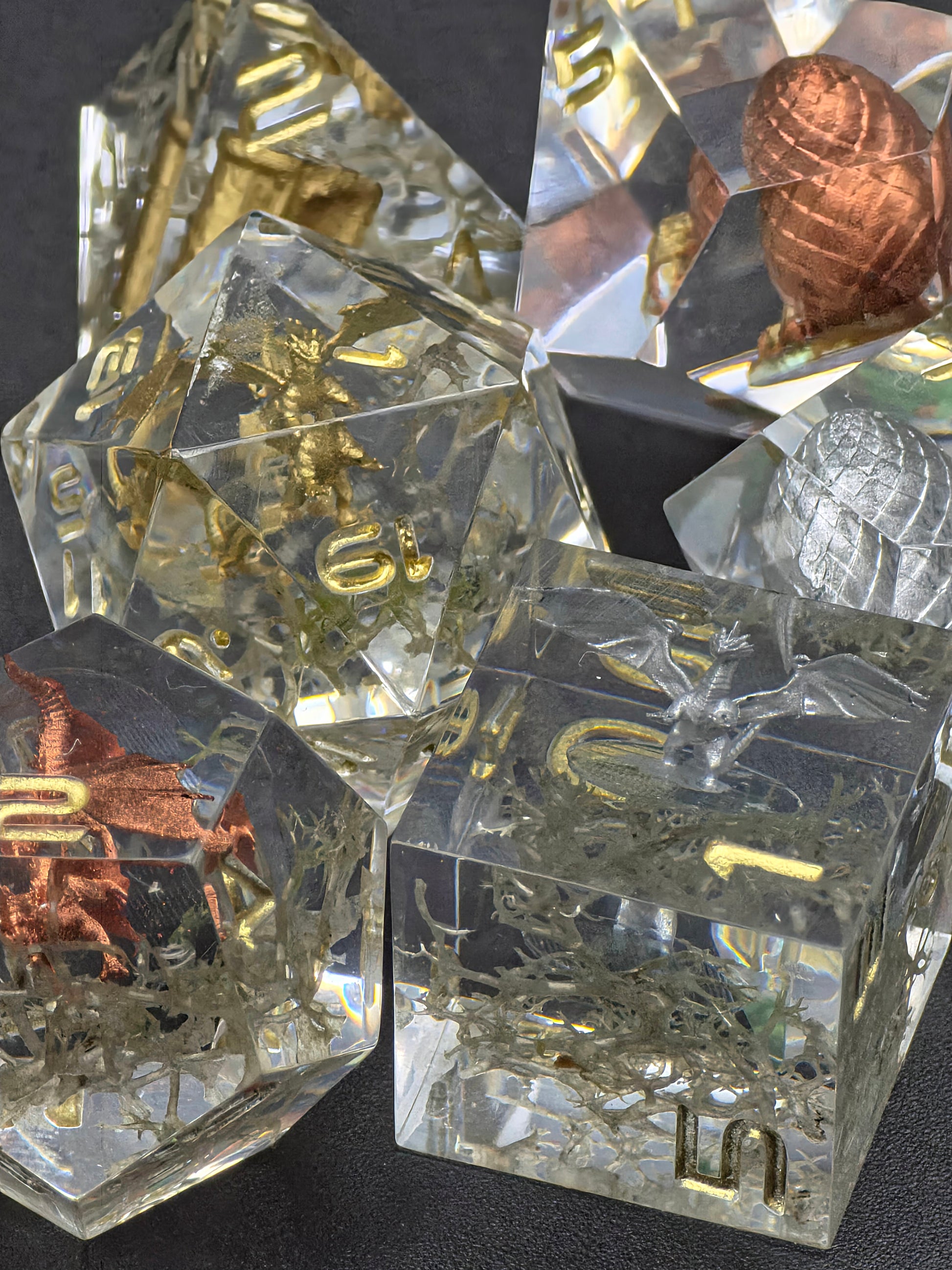In klarem, facettiertem Harz ruhen sieben unterschiedliche Diaramen, jede ein eigenständiges Relikt. Gold, Silber und Bronze stehen nicht nur für Metall, sondern für Blutlinien, Schwüre und Zeitalter. Die Drachen, die hier verewigt sind, schliefen nicht – sie wachten. Über Eier, über Wissen, über Macht, die niemals leichtfertig weitergegeben werden durfte.